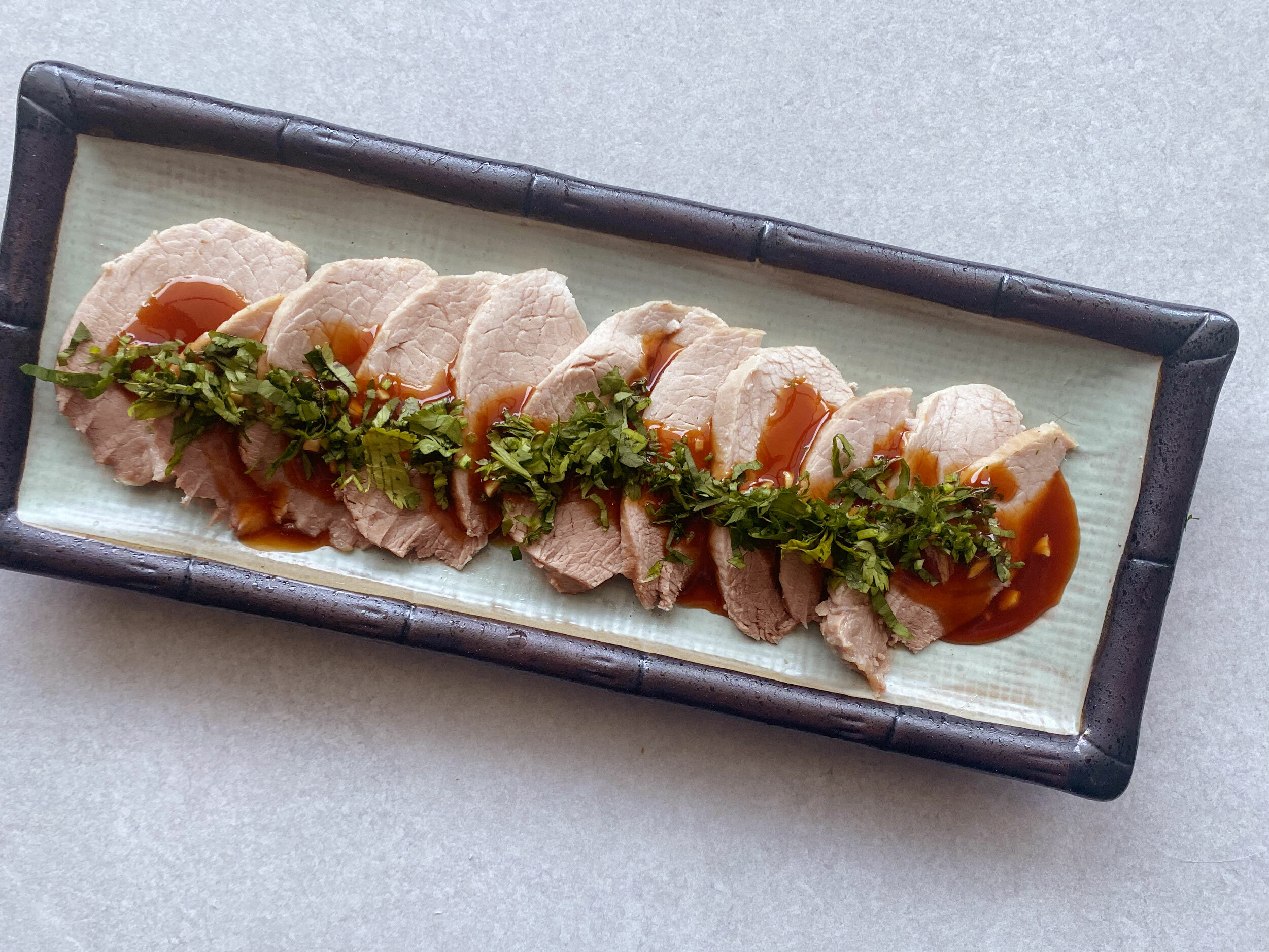 3.肉片擺盤,淋上五味醬,撒上香菜增加風味。