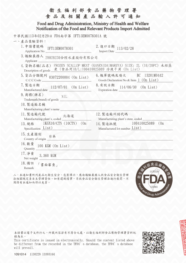 北海道生食級干貝 檢驗報告