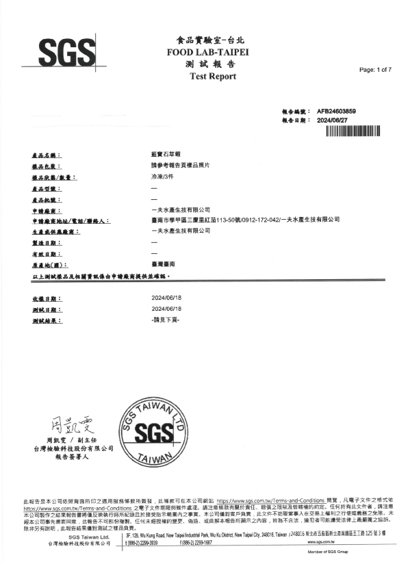 台灣特級藍寶石草蝦 檢驗報告