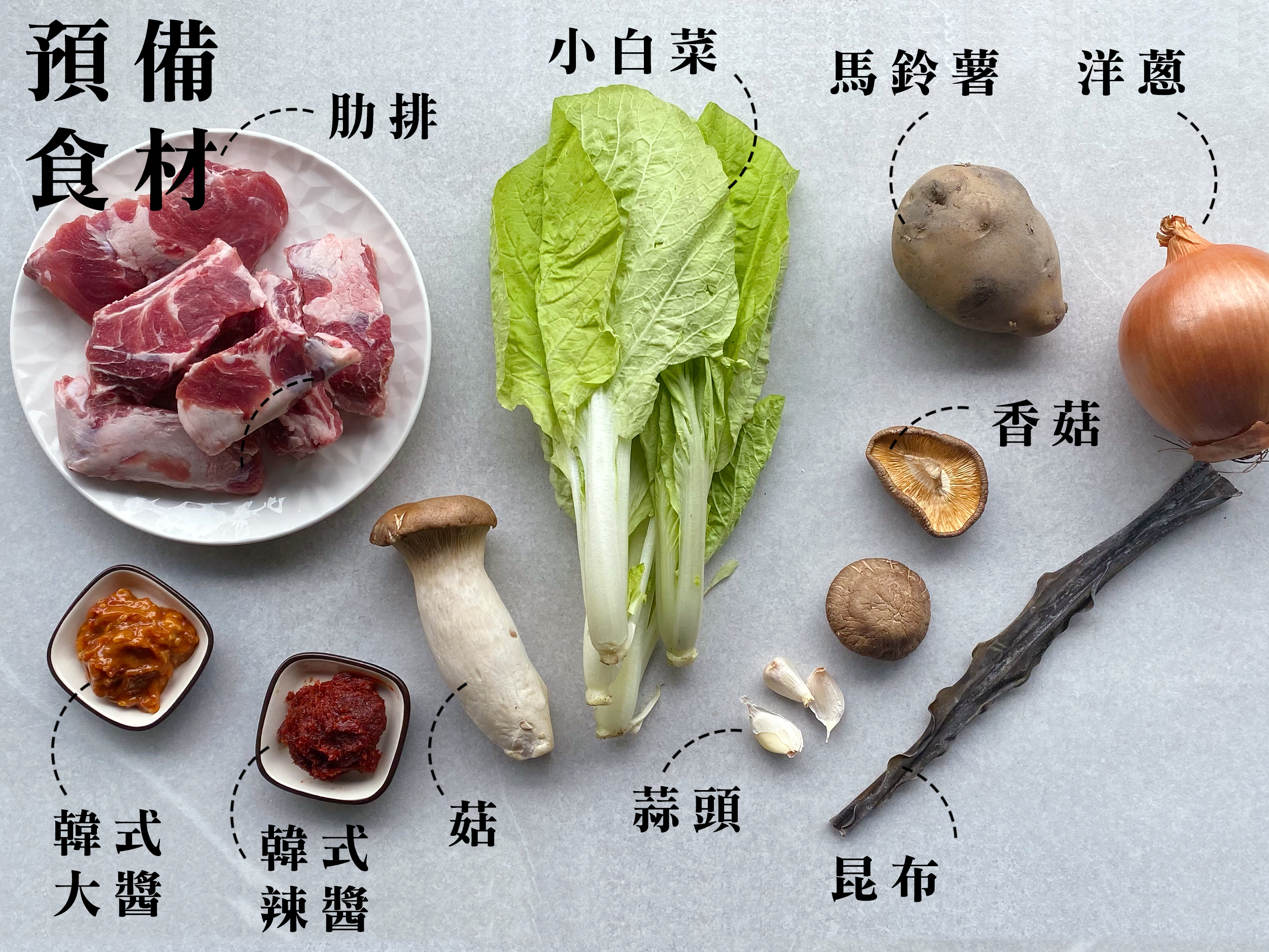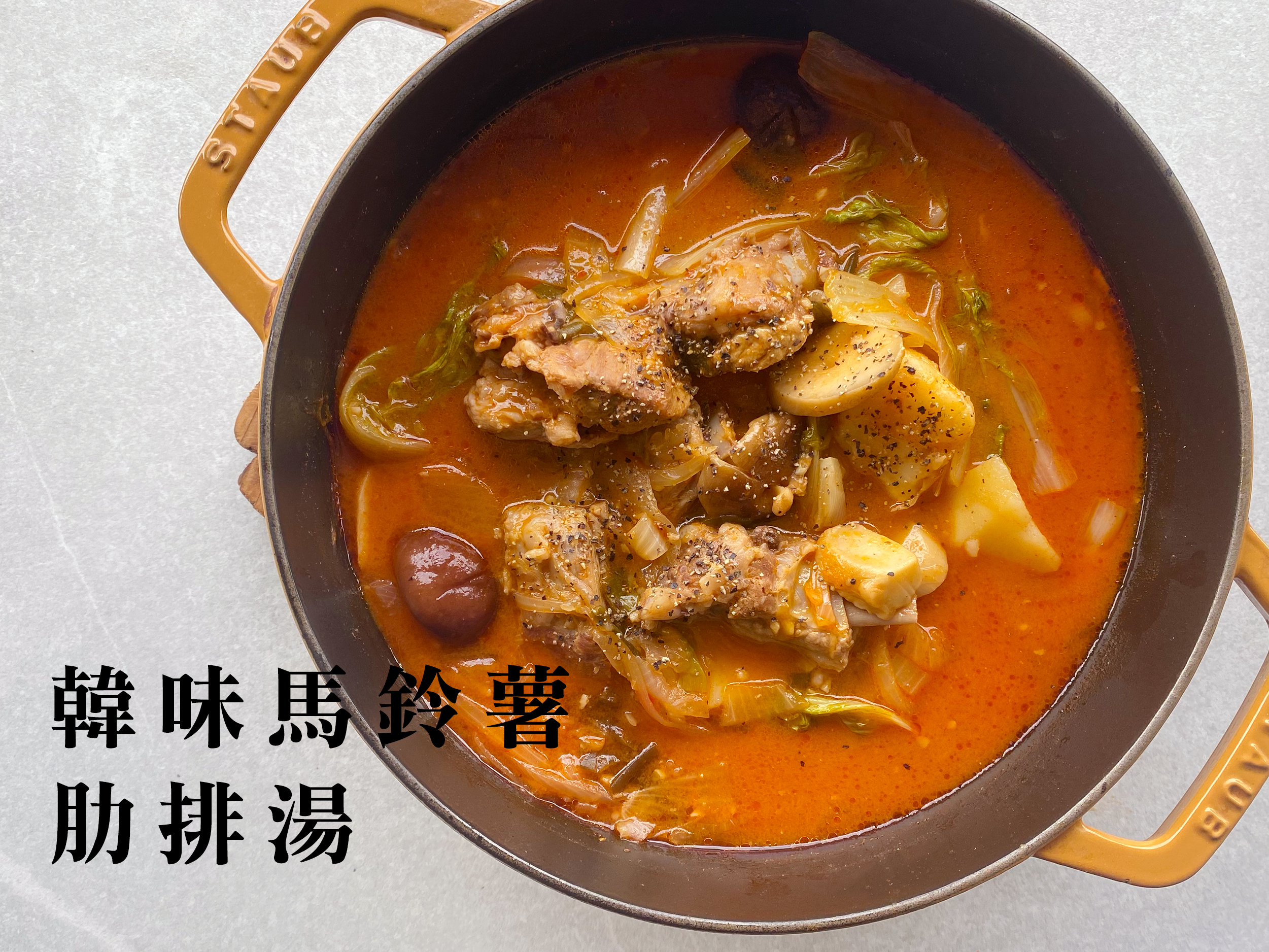 3.肋排、馬鈴薯、蔥、蒜 、韓式大醬、韓式辣醬一起放入,蓋上鍋蓋燉煮30分鐘至肋排、馬鈴薯軟爛。