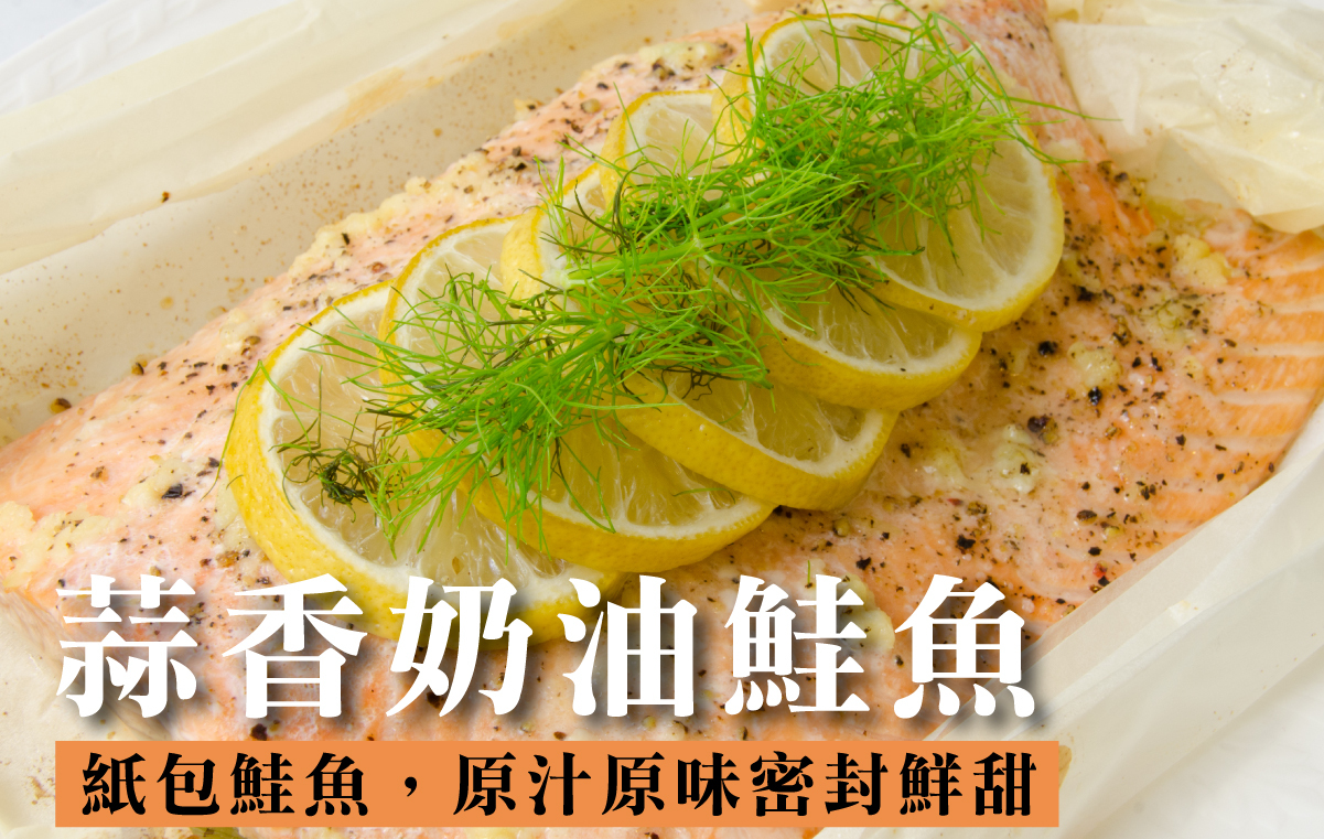 接下來,讓我們來試試「蒜香奶油鮭魚」。原汁原味密封鮮甜,全部包起來放進去電鍋、烤箱或氣炸鍋就完成了,零失敗,好吃又好快,打開就美美的~