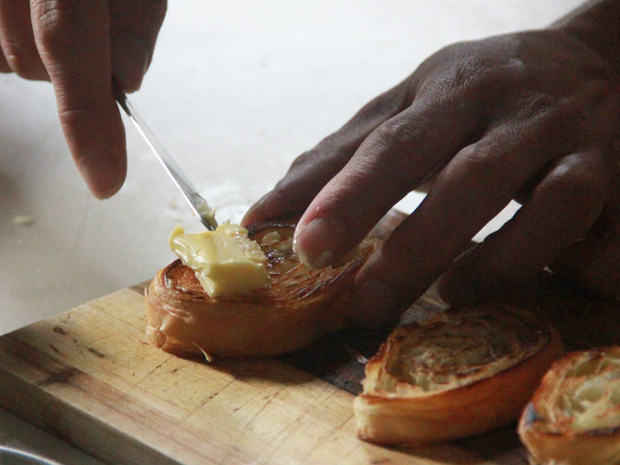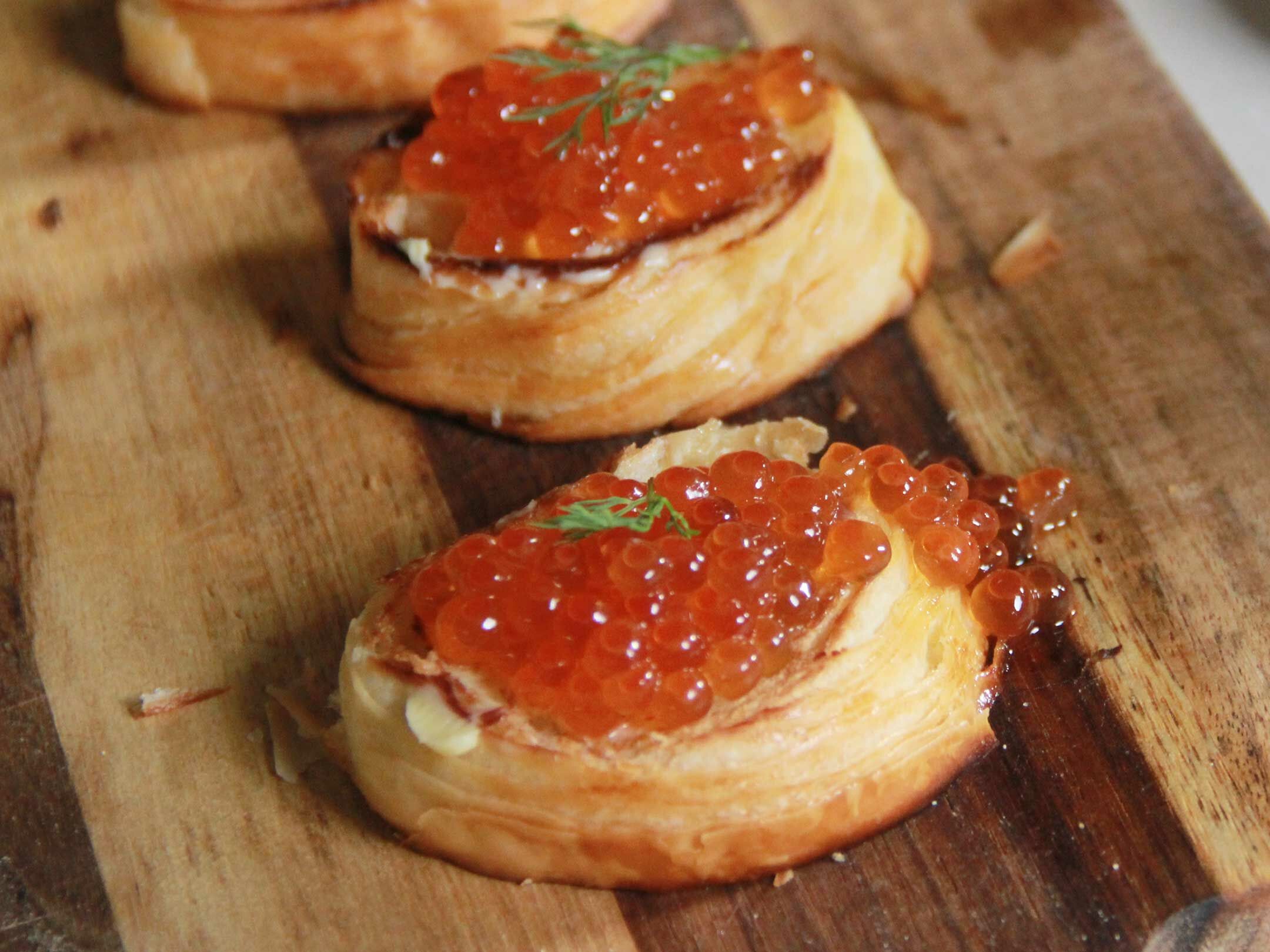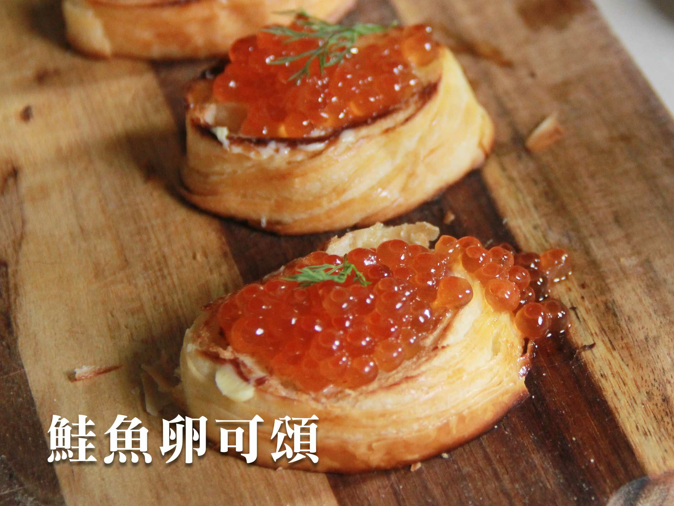 3.組合可頌:在可頌片上抹上一層奶油,最後鋪上 鮭魚卵。