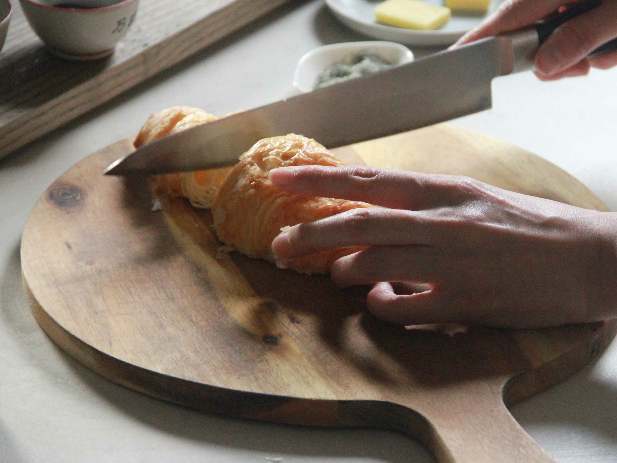 1.準備可頌:將可頌切成小片,類似法式麵包的 Bruschetta 形狀