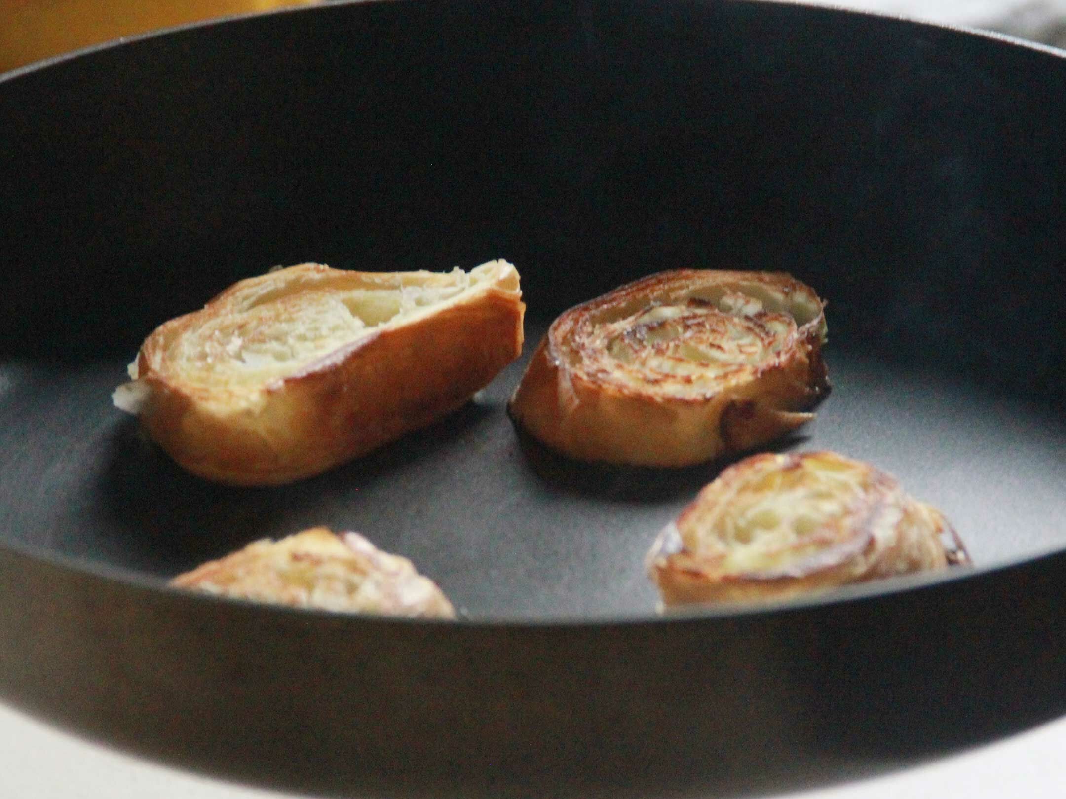 2. 煎至酥脆:在預熱的乾鍋中輕輕煎烤可頌片,直到表面呈現金黃酥脆的口感。