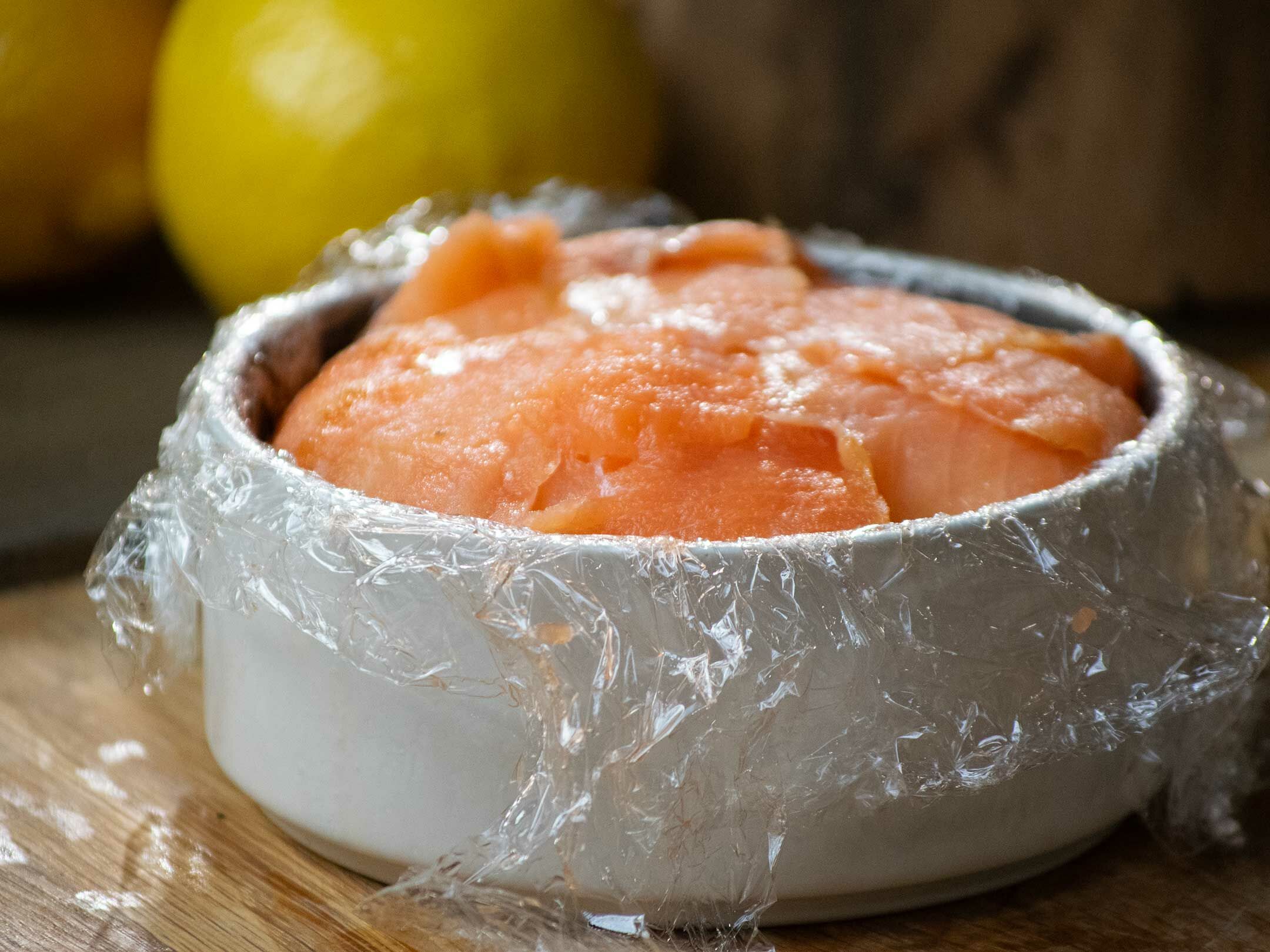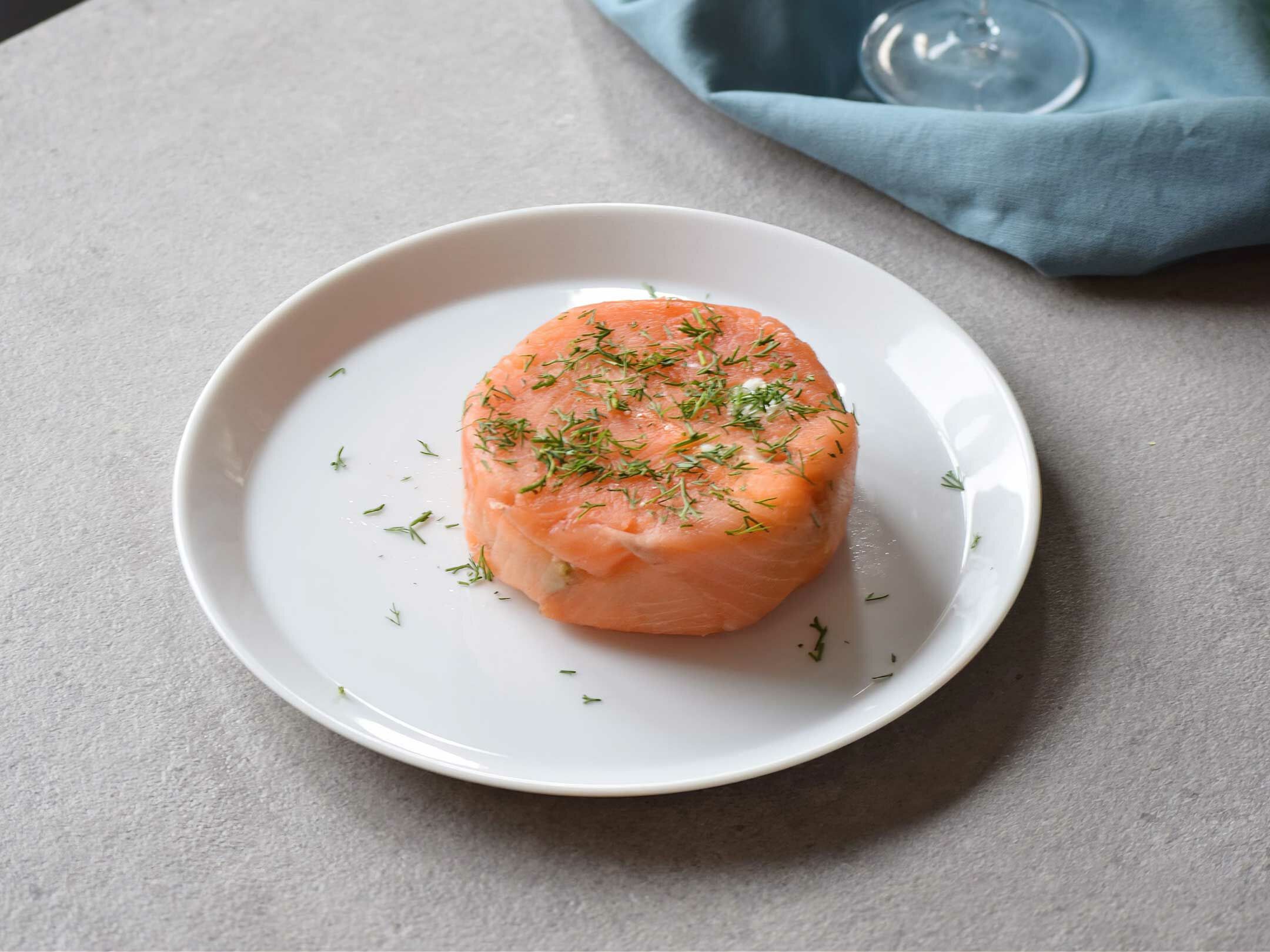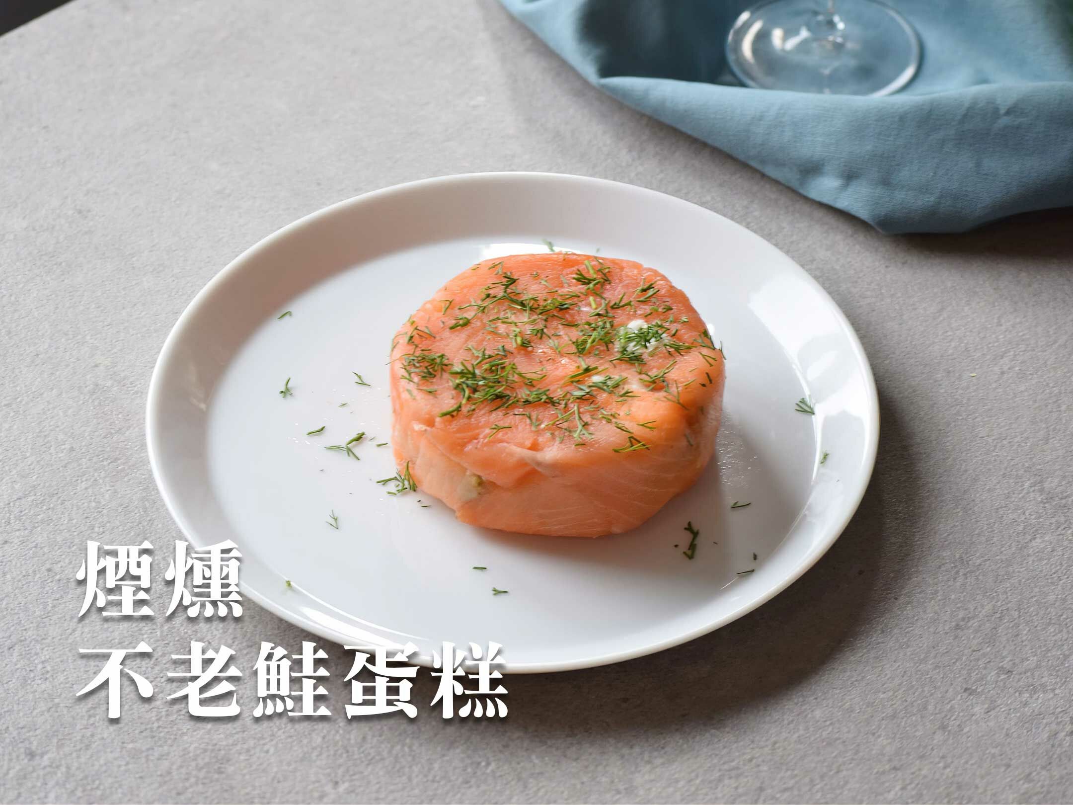 4.冷藏完成後,小心倒扣,取下保鮮膜,就會看到完美成型的不老鮭蛋糕!然後撒上新鮮蒔蘿再刨一點檸檬皮屑,香氣瞬間提升