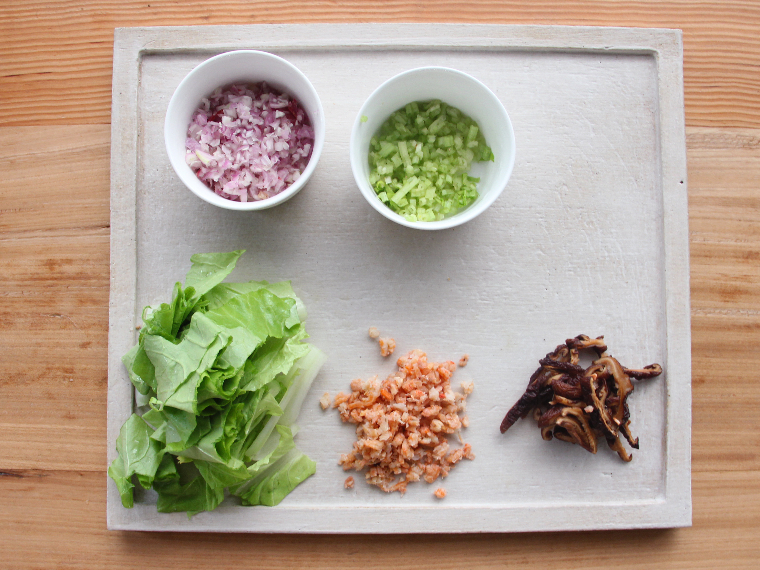 Step 2: 乾香菇切絲、蝦米切細碎、小白菜切段、芹菜切珠備用。