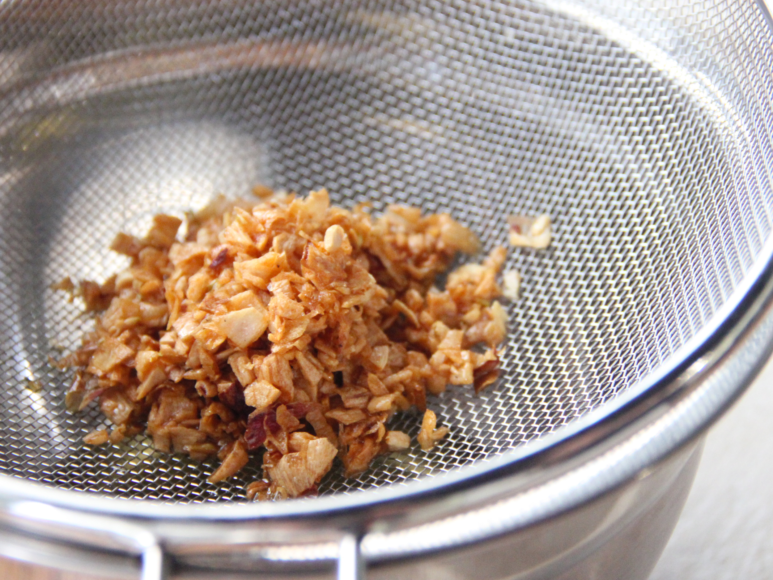 Step 1: 【紅蔥油作法】起鍋加入植物油,油溫達70度後加入去皮切末之紅蔥頭,以中小火不停辦炒紅蔥頭,顏色開始變黃後轉小火,炸至略黃後撈起,待紅蔥頭放涼後在倒回油中裝瓶即可。