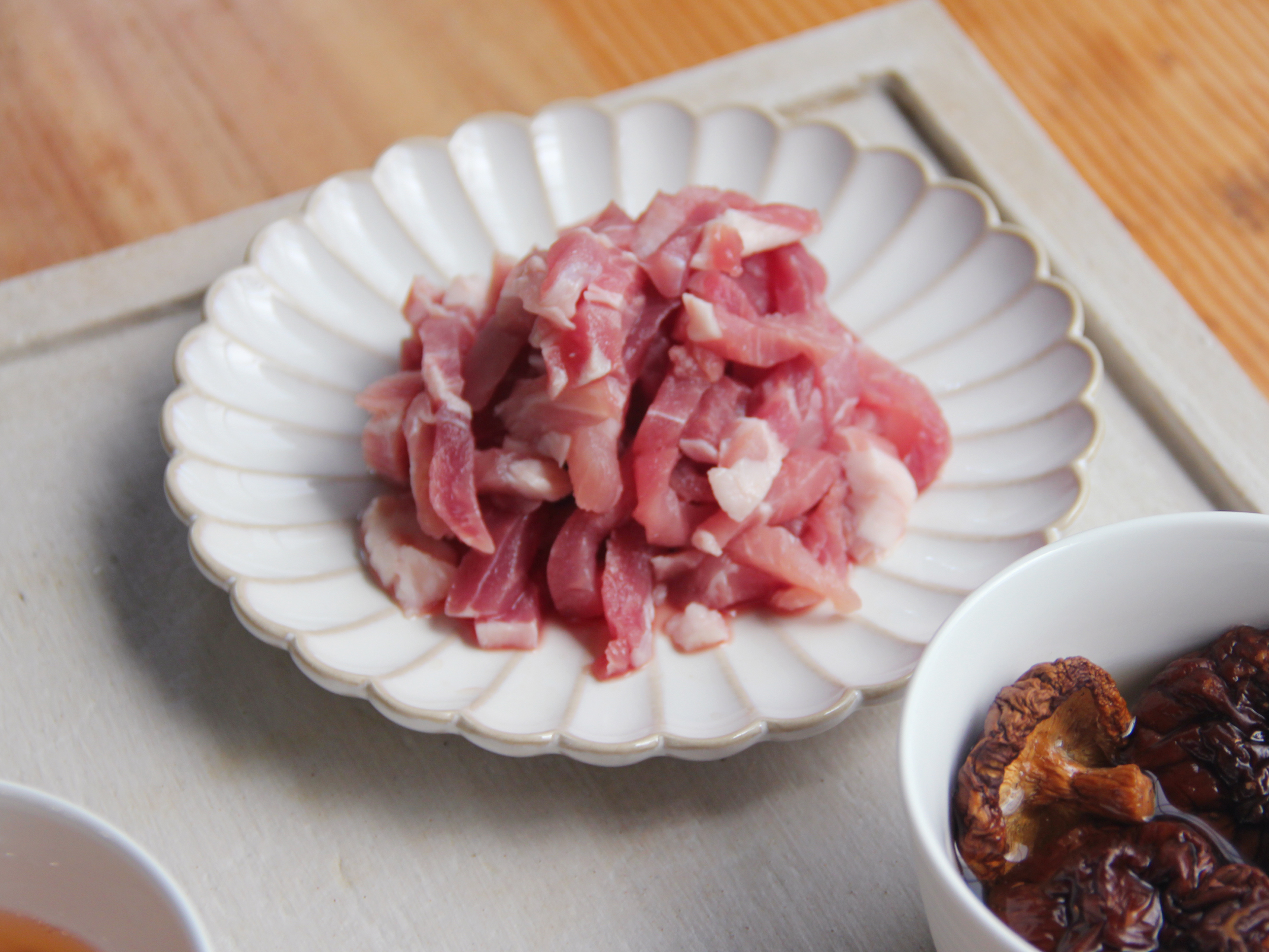 Step 3: 將豬肉絲放入醬油、胡椒粉抓醃後備用。