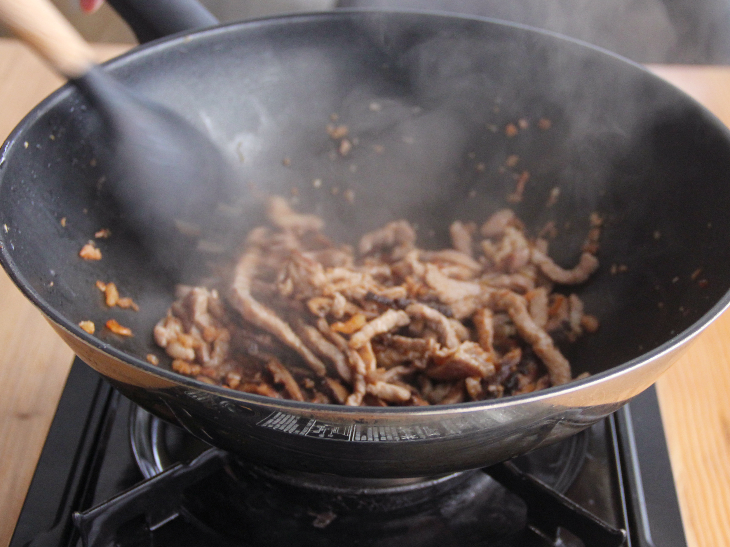 Step 4:起鍋乾煸香菇絲、蝦米,炒香後加入1茶匙紅蔥頭油,倒入豬肉絲翻炒入味。