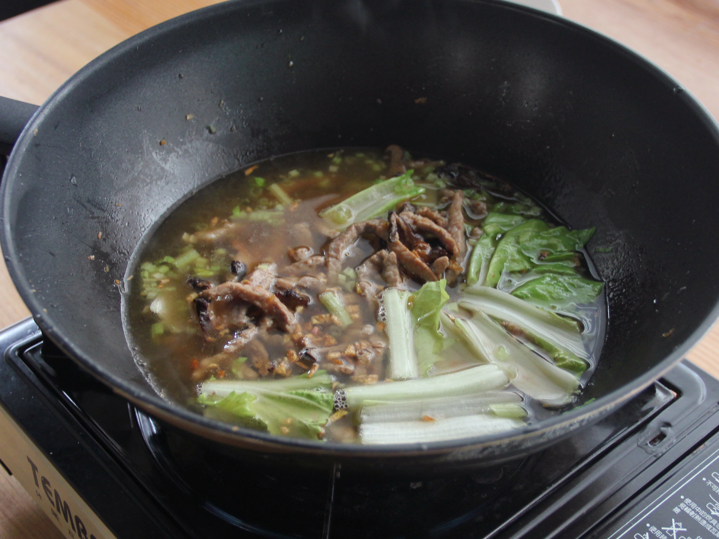 Step 5:再放入小白菜梗段、芹菜珠、適量紅蔥酥,接著將高湯、香菇水、蝦米水拌勻後倒入鍋中煨煮。