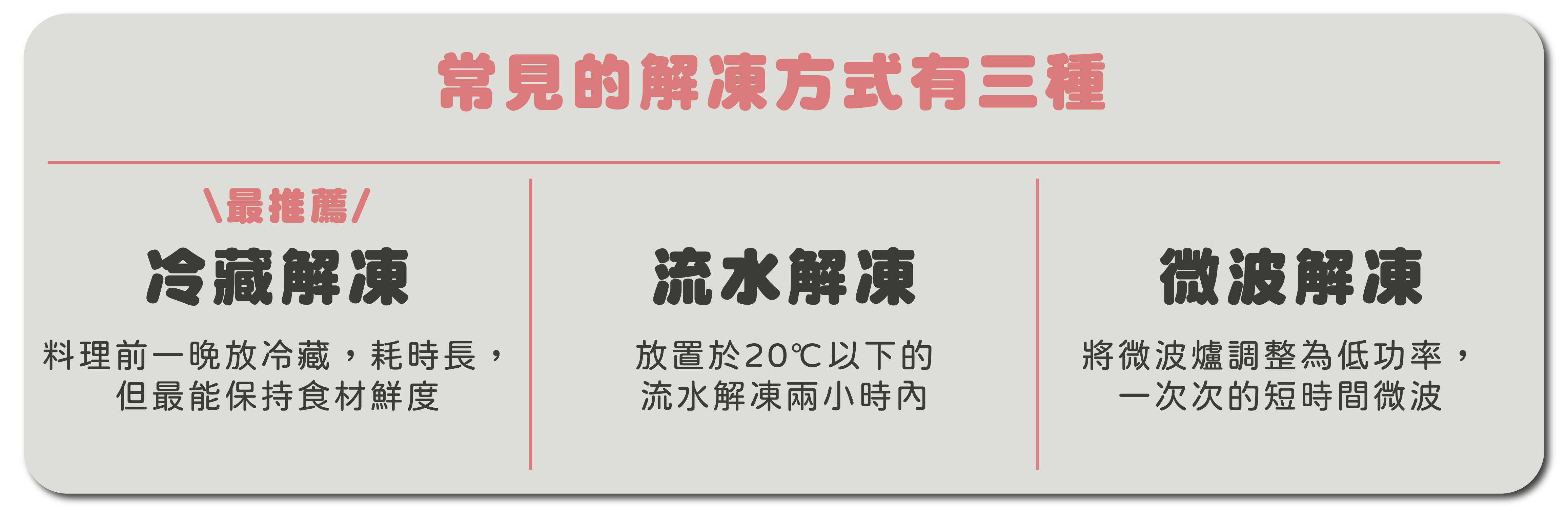 最推薦冷藏解凍,雖耗時長,但最能保持食材鮮度。