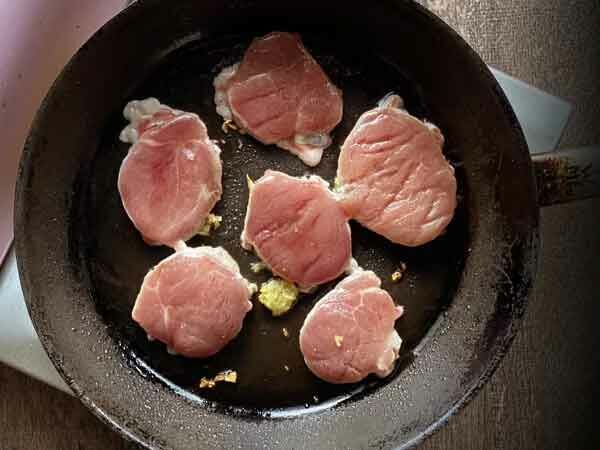 1.中火將蒜末與薑末爆香30秒,加入豬菲力煎熟