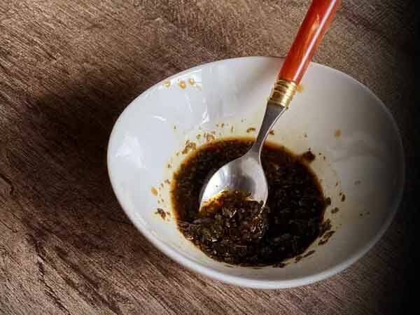 2.製作溫沙拉醬:將紅糖、羅勒、醬油、檸檬汁、水、奧樂剛煮滾