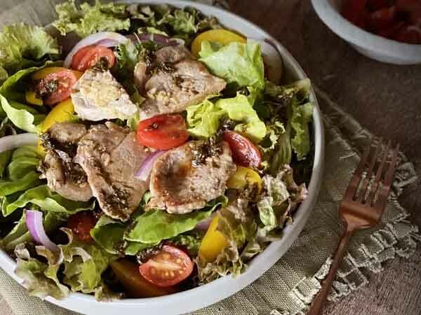 3.準備生菜、番茄、洋蔥、甜椒及豬肉放入碗中,淋上沙拉醬即可