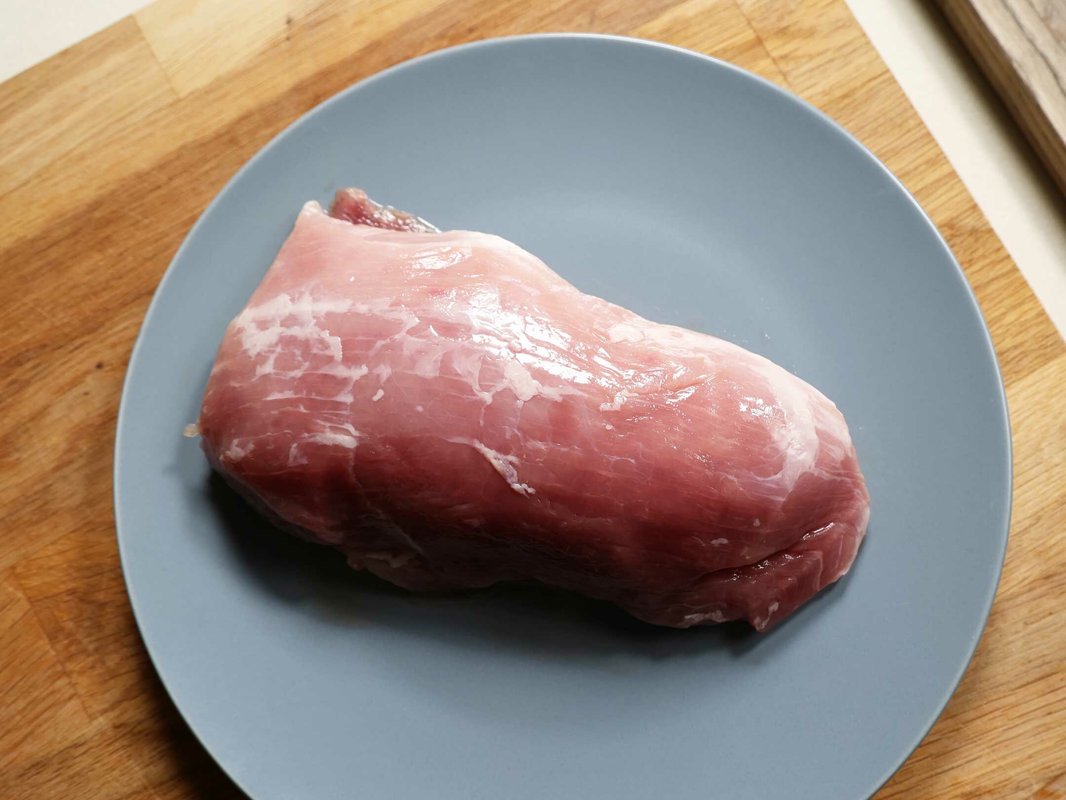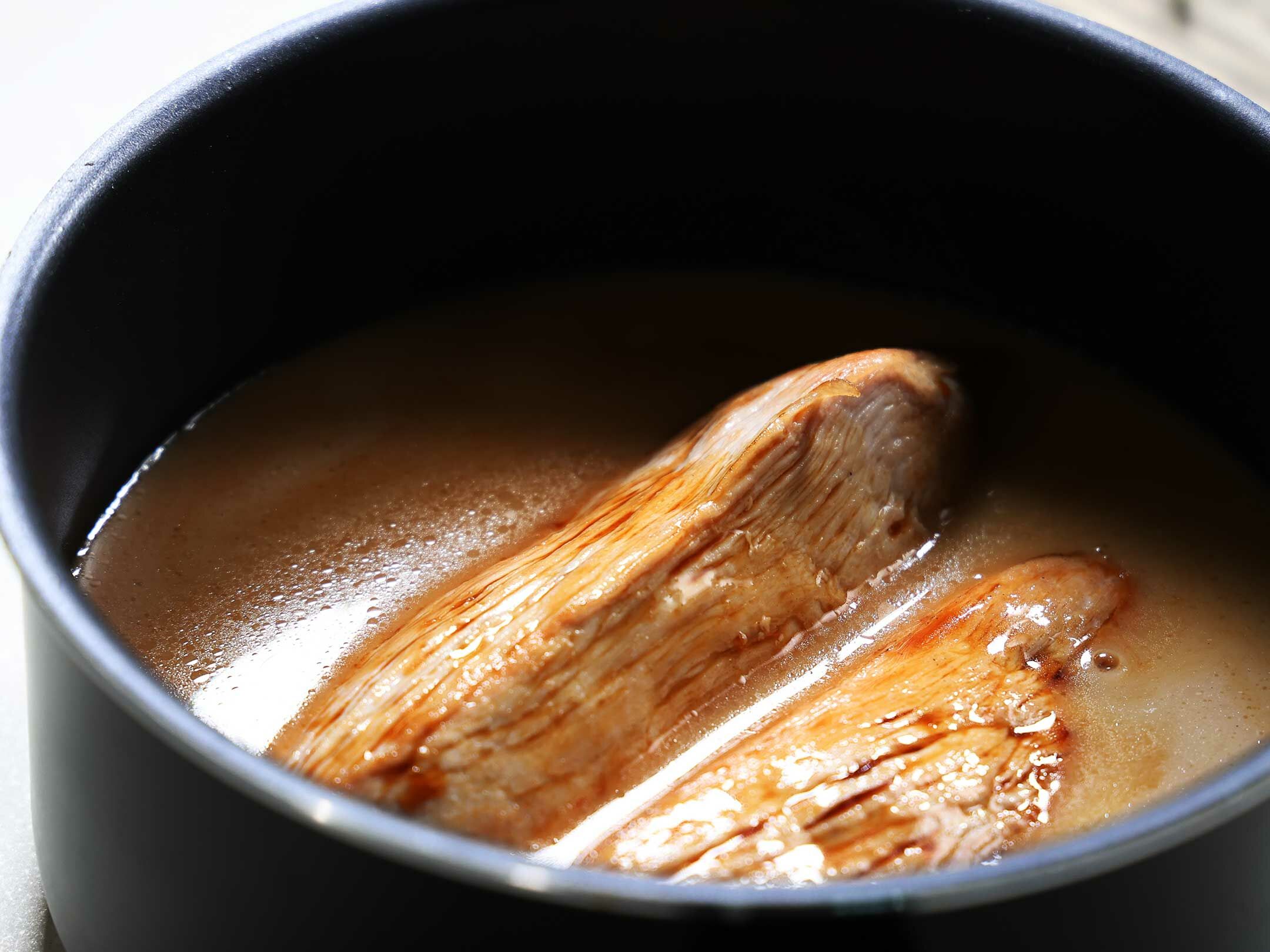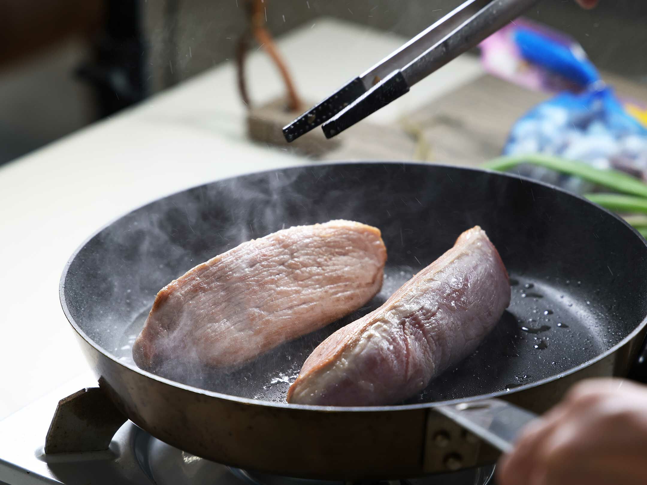 1. 1大匙油,開中火,將枕頭肉放入,煎至肉反白