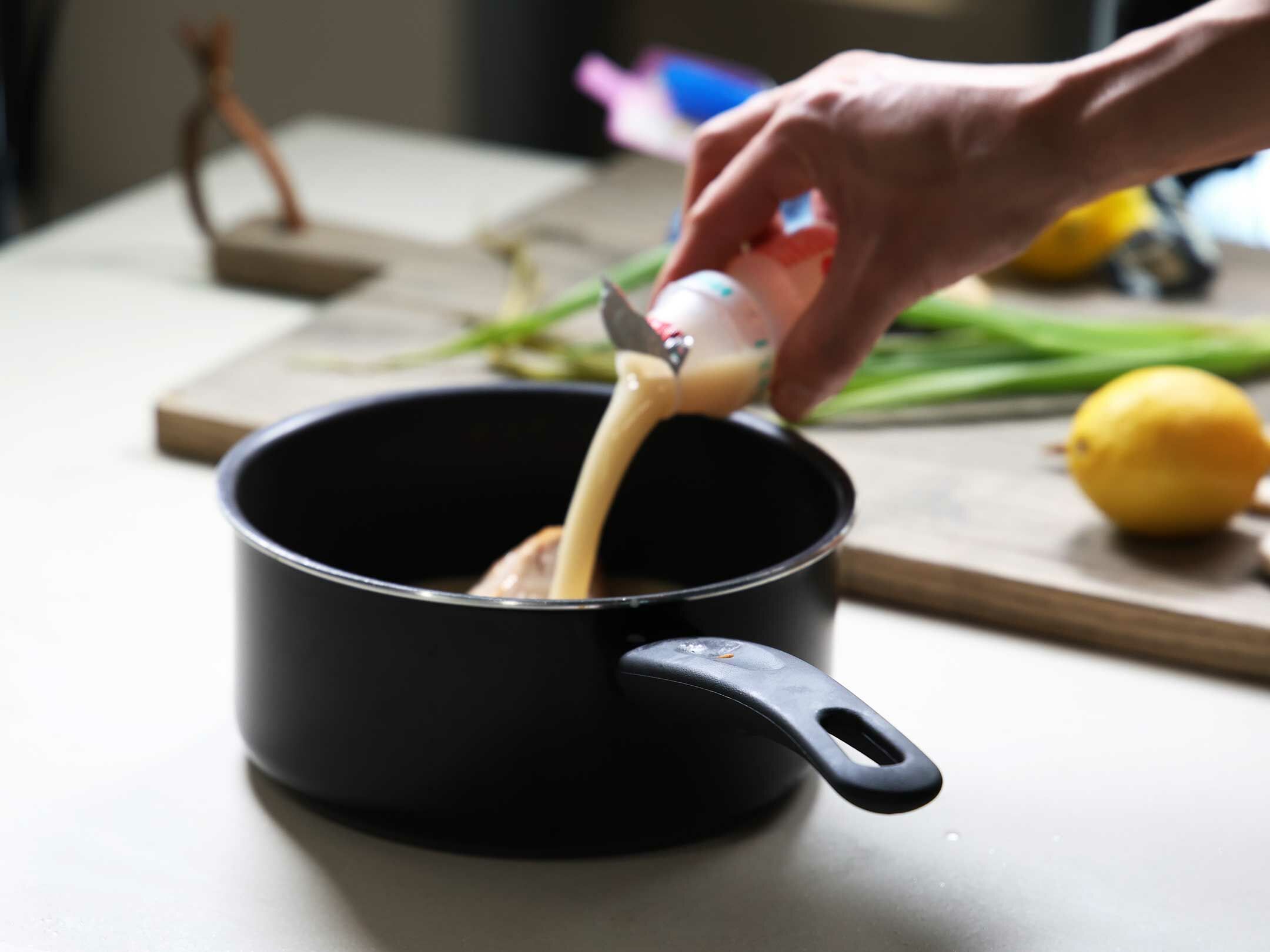 2. 準備好燉鍋,加入三瓶養樂多和一瓶醬油(養樂多瓶裝)。