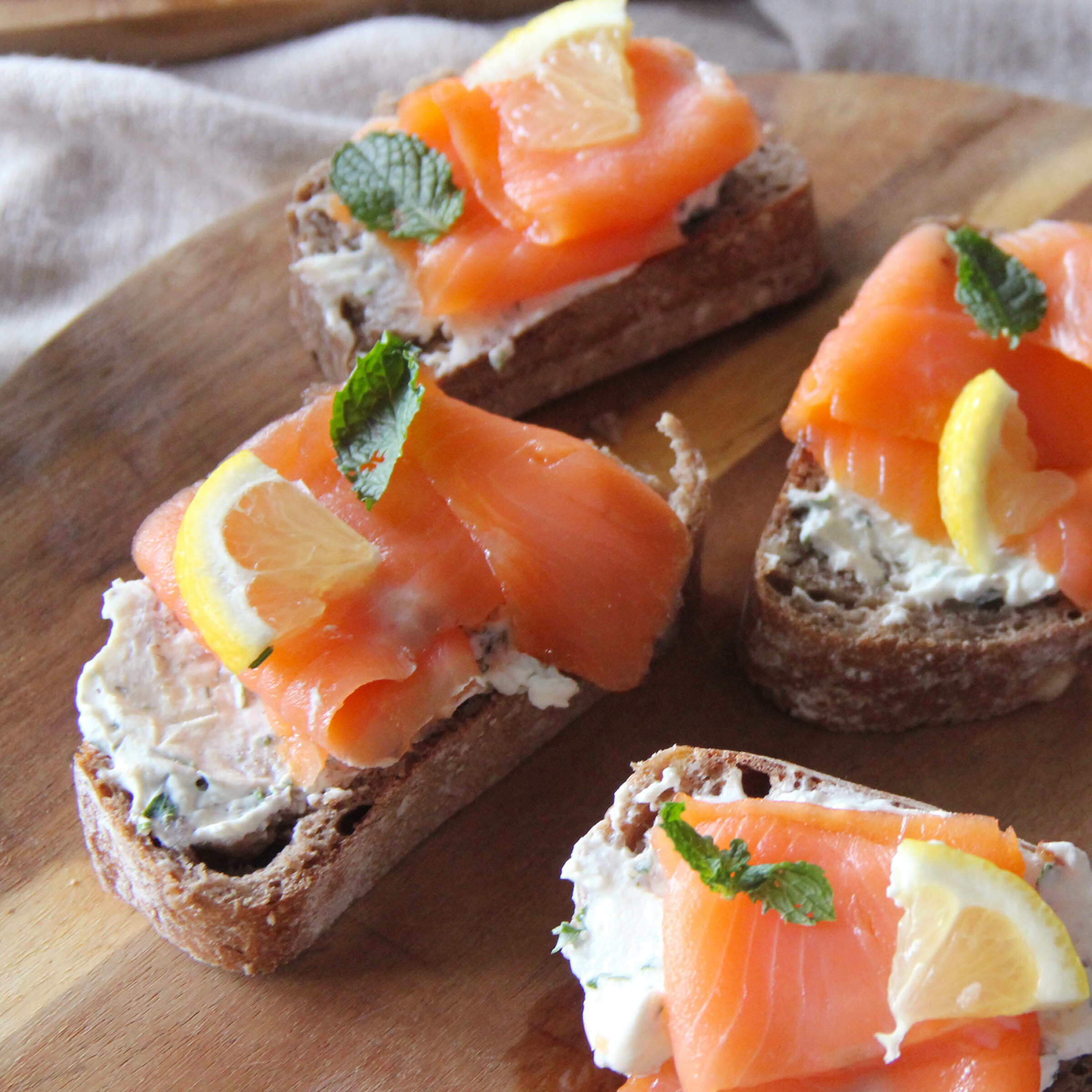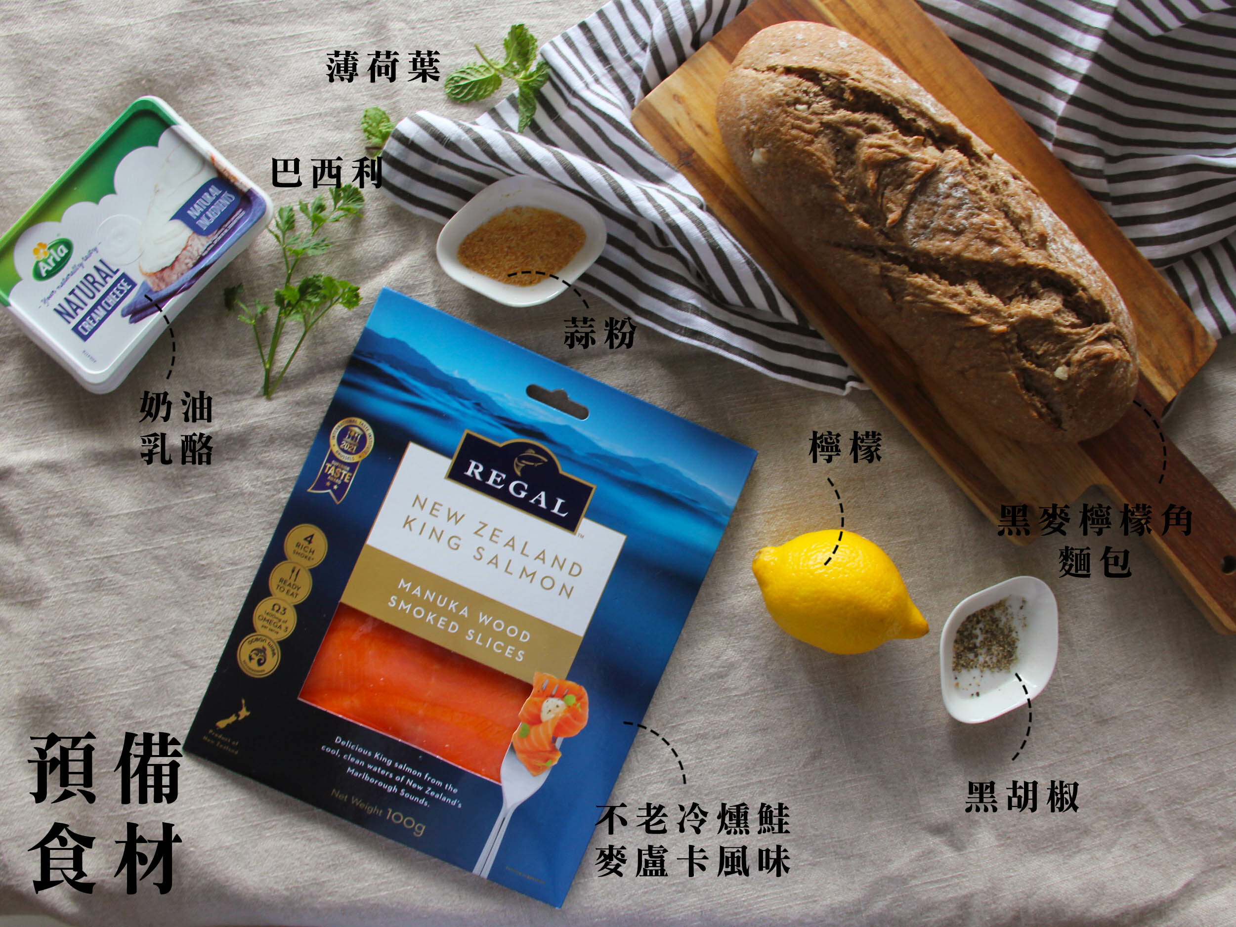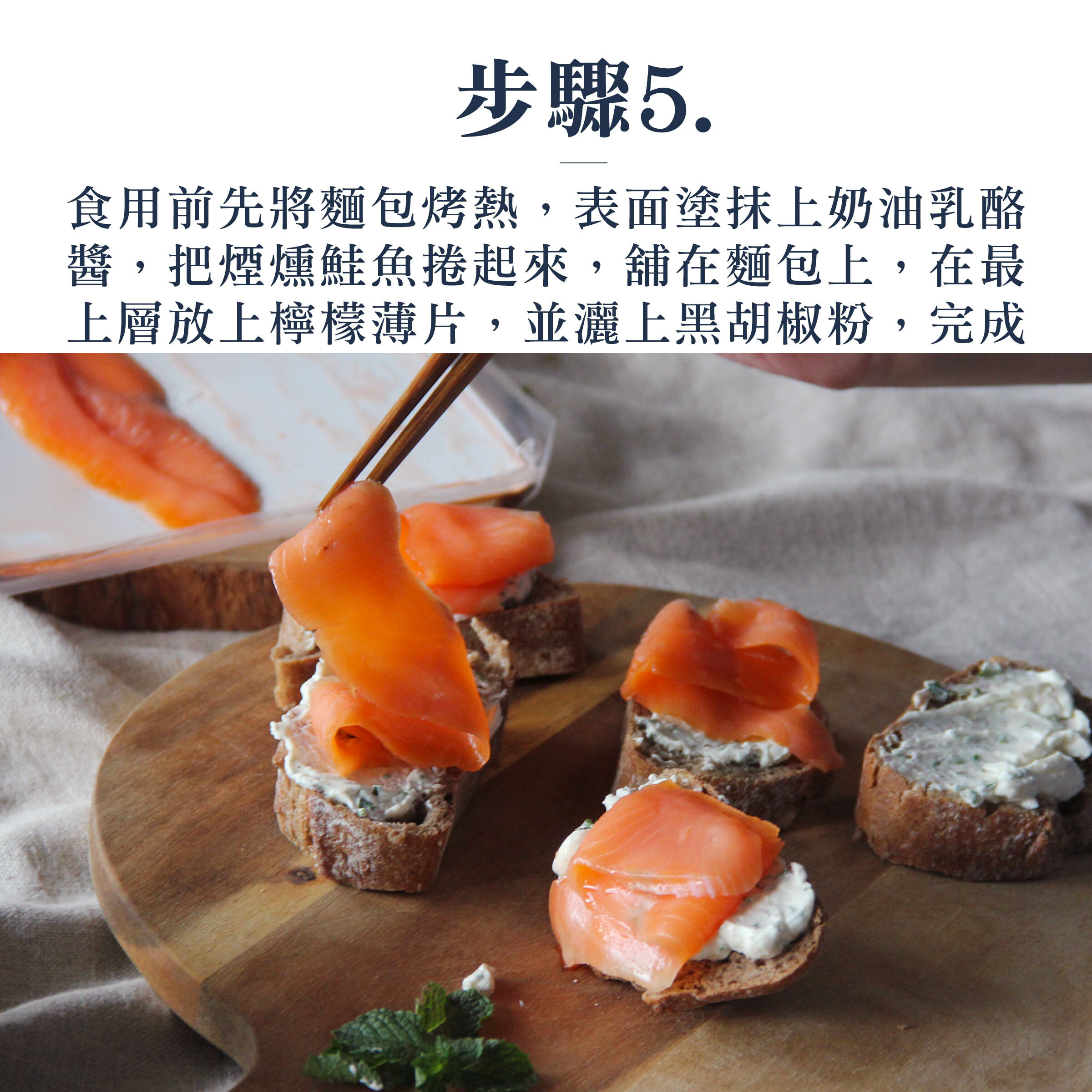 5、食用前先將麵包烤熱,表面塗抹上奶油乳酪醬,把煙燻鮭魚捲起來,舖在麵包上,在最上層放上檸檬薄片,並灑上黑胡椒粉,完成