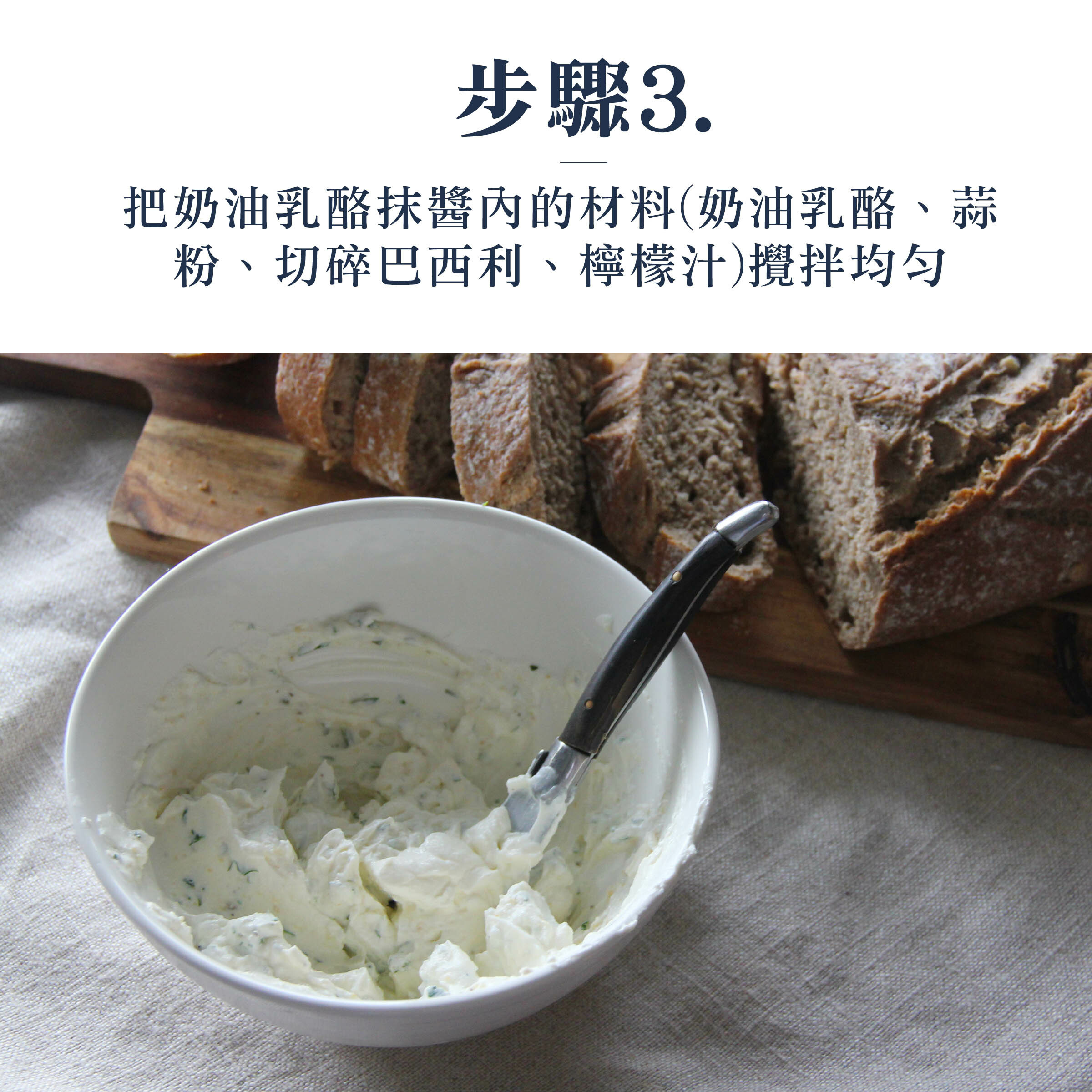 3.把奶油乳酪抹醬內的材料(奶油乳酪、蒜粉、切碎巴西利、檸檬汁1/2顆)攪拌均勻