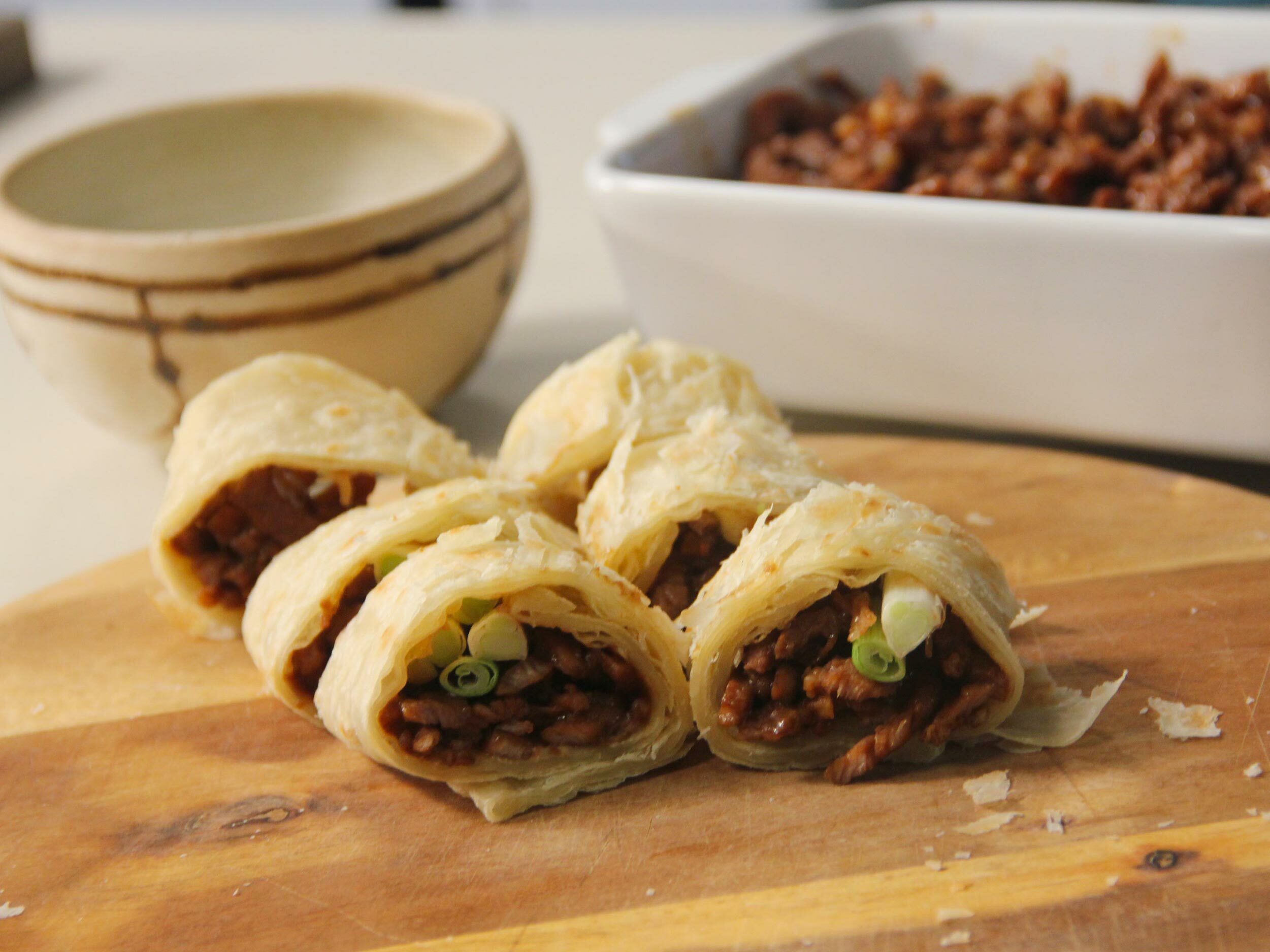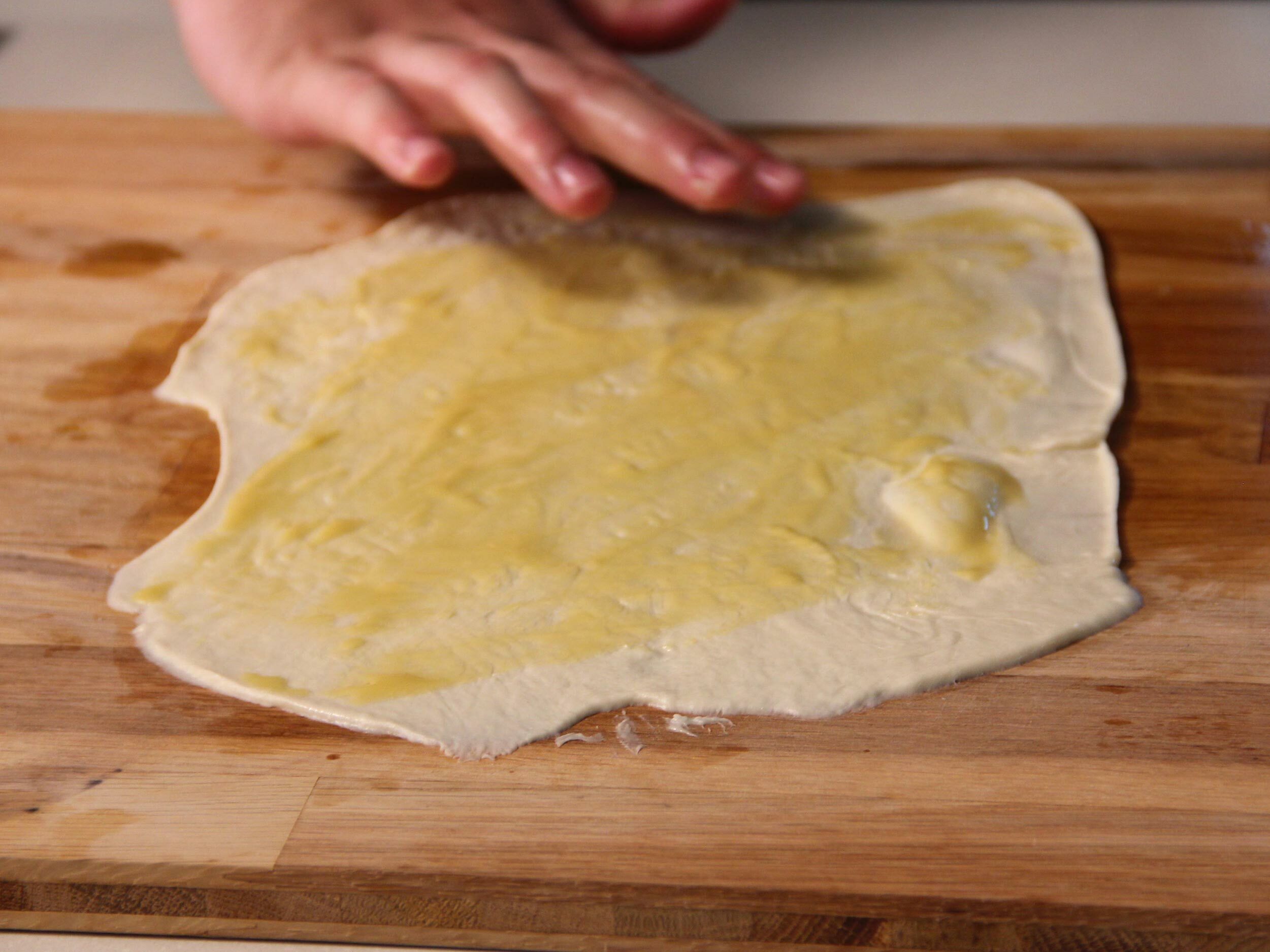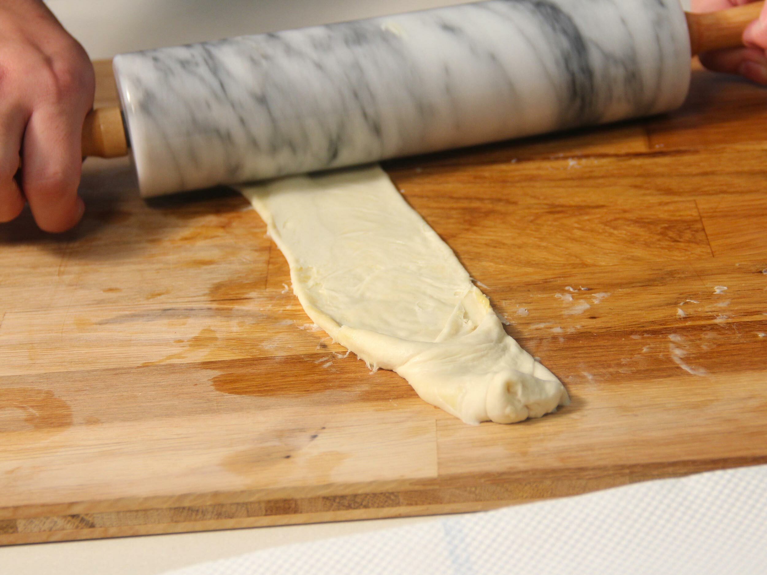 5.麵團桿呈長方形,抹上油酥揉成細長條,繞圈呈圓形大餅,最後桿平