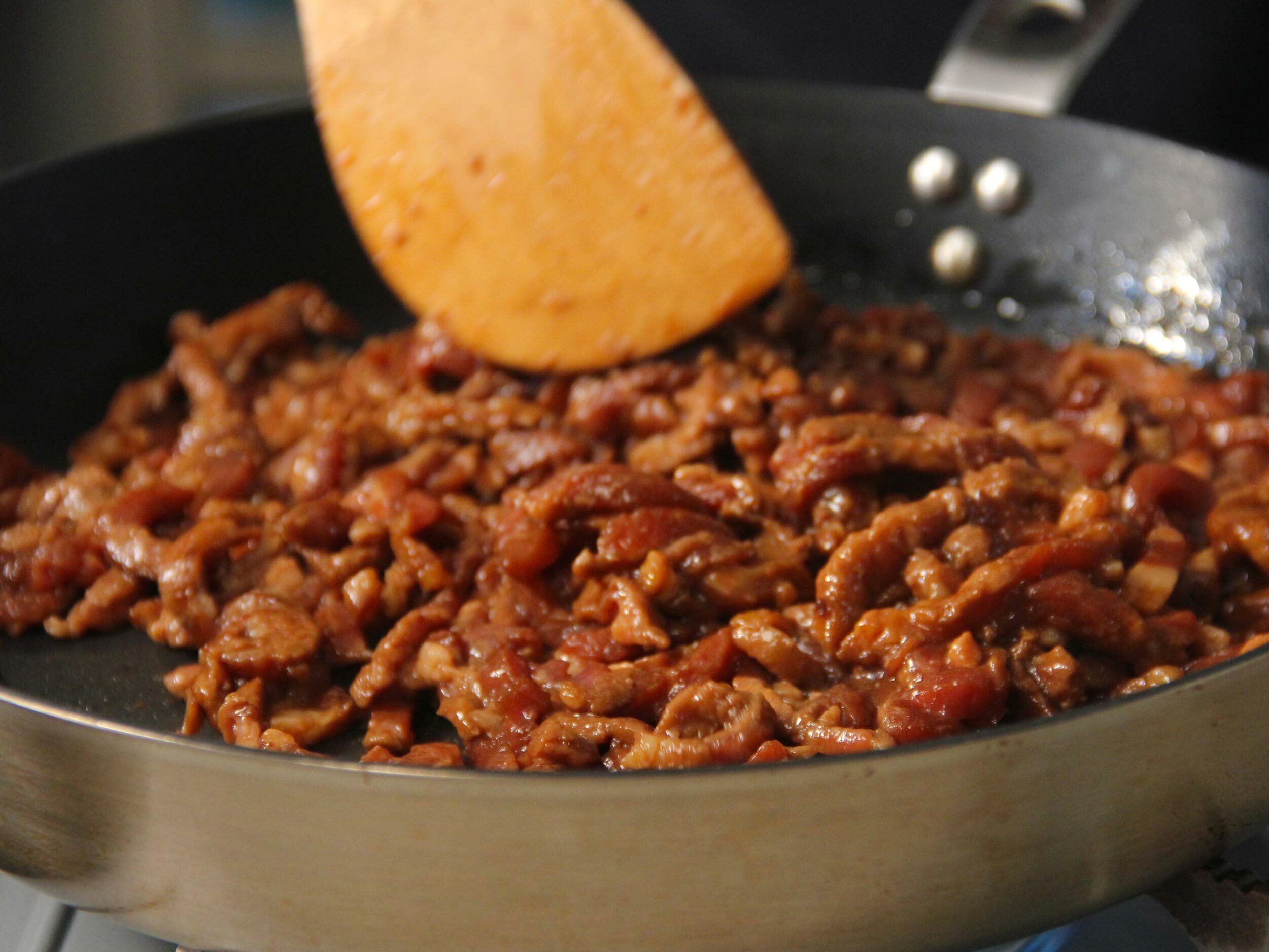 7.放油放入肉絲拌炒,加入甜麵醬鈔至全熟收汁即可