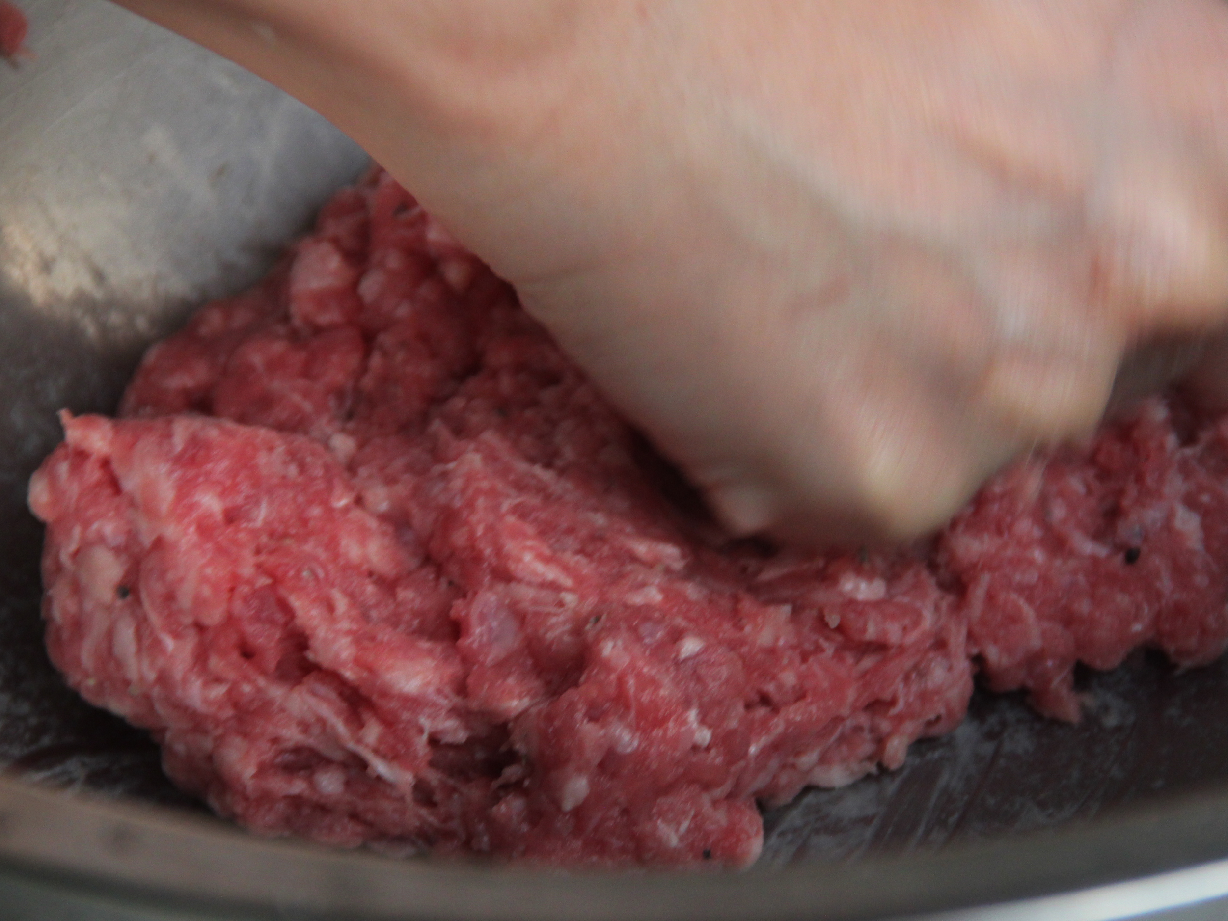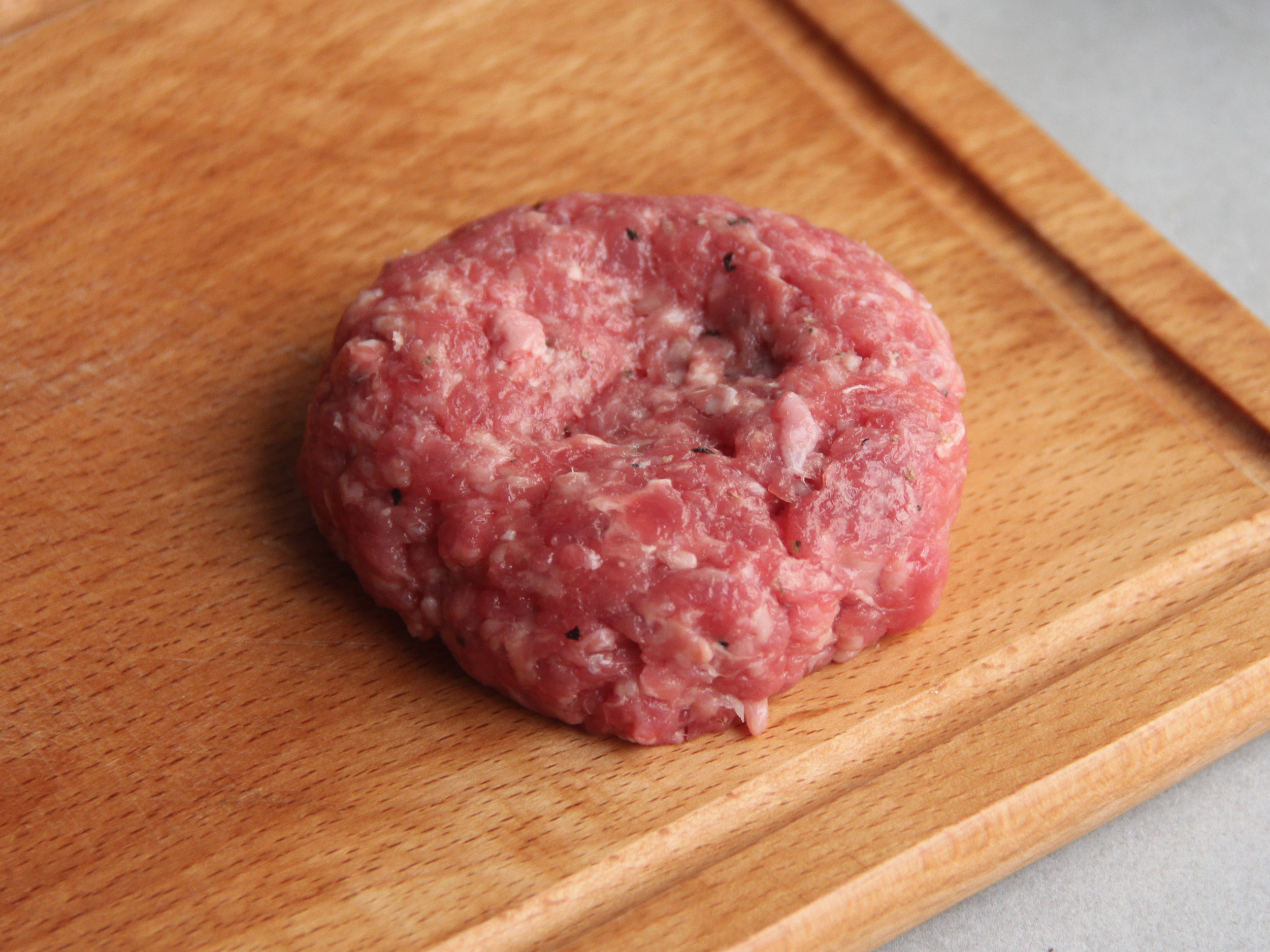 Step 2.取適量牛肉,拍打成肉丸後(把空氣打出)。用手壓成漢堡排