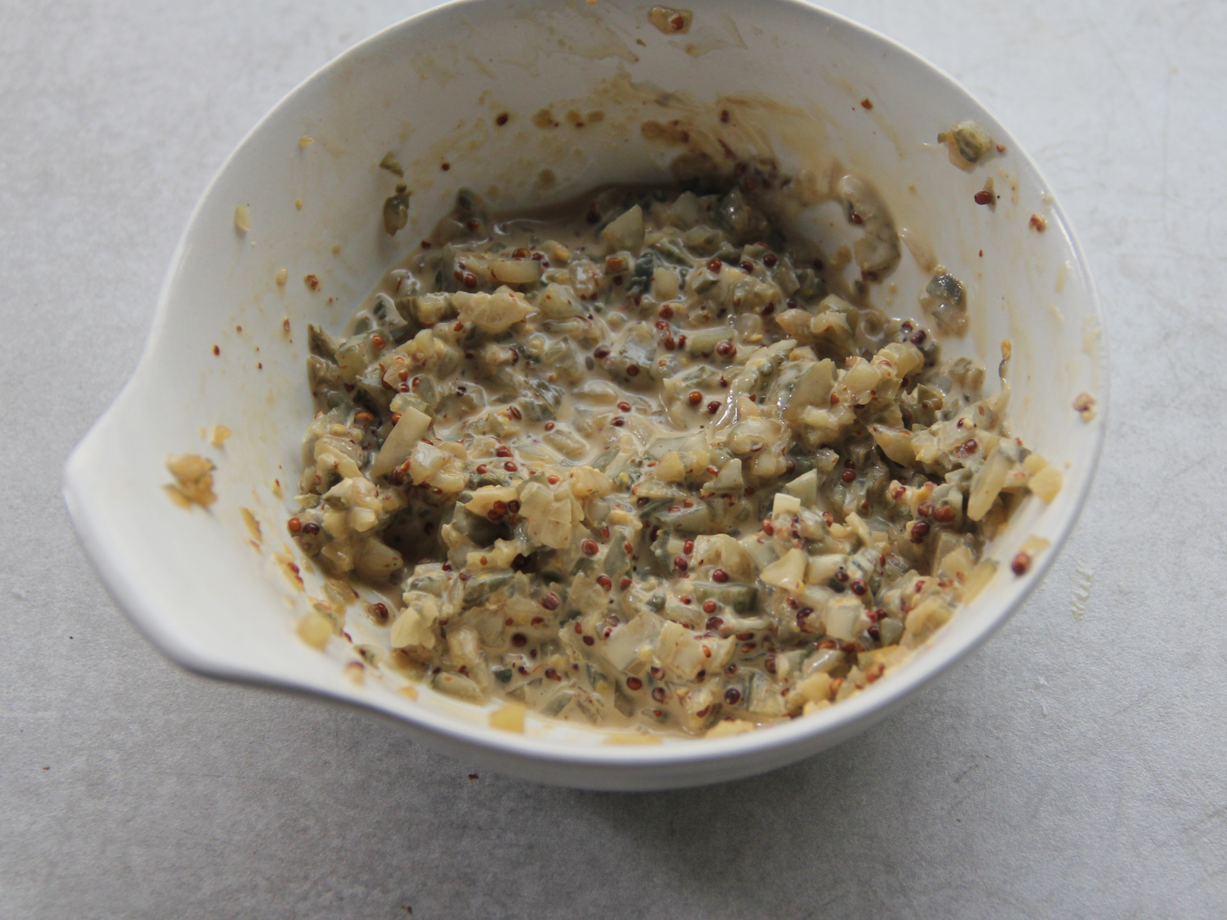 Step 3.容器內放入適量芥末籽醬、美乃滋、番茄醬、梅林辣醬半匙及切碎的酸黃瓜拌勻