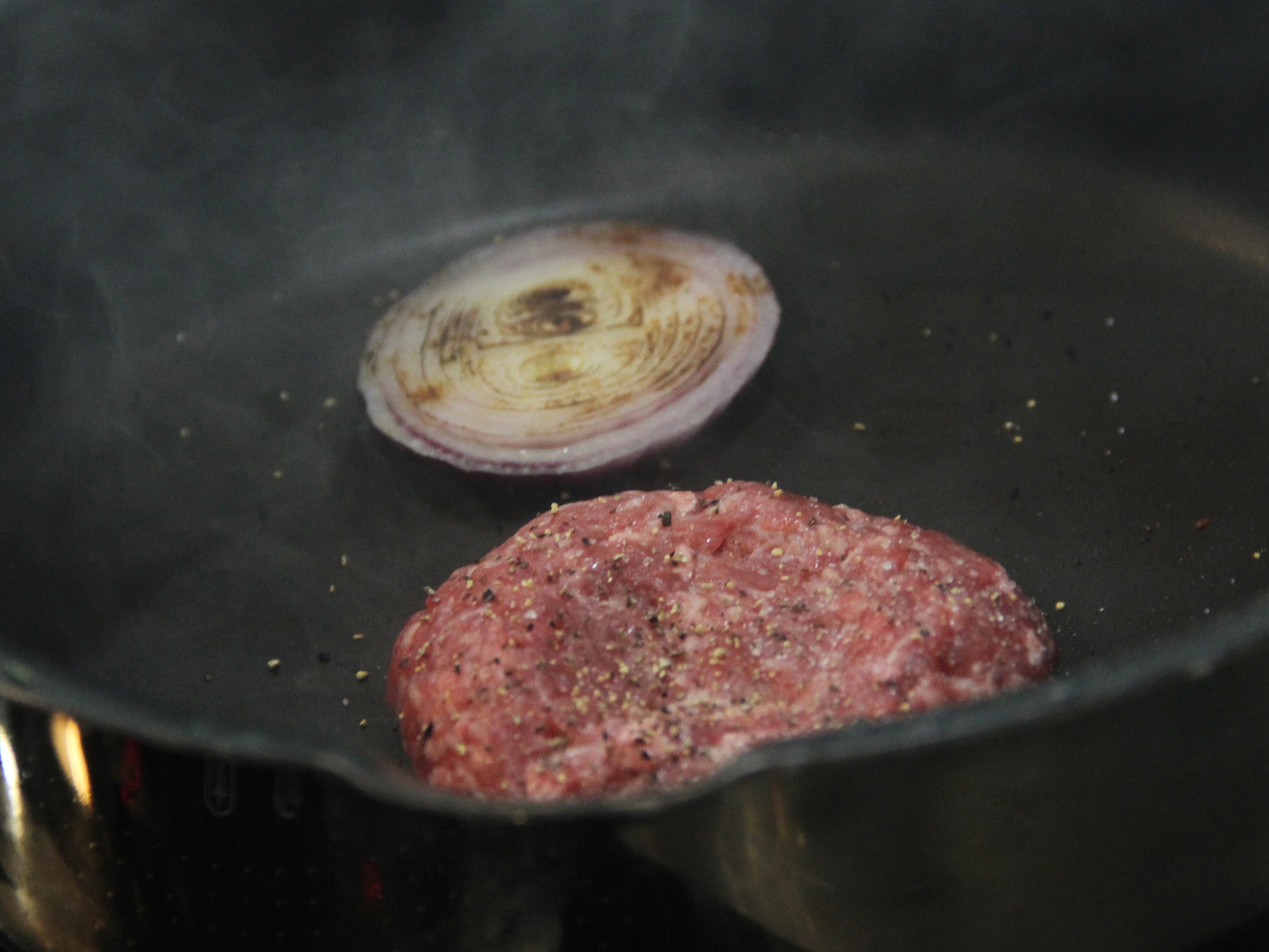 Steep 4.將洋蔥切片與漢堡排一起下鍋煎。漢堡排底部變成咖啡色時即可翻面,將洋蔥拿起轉小火