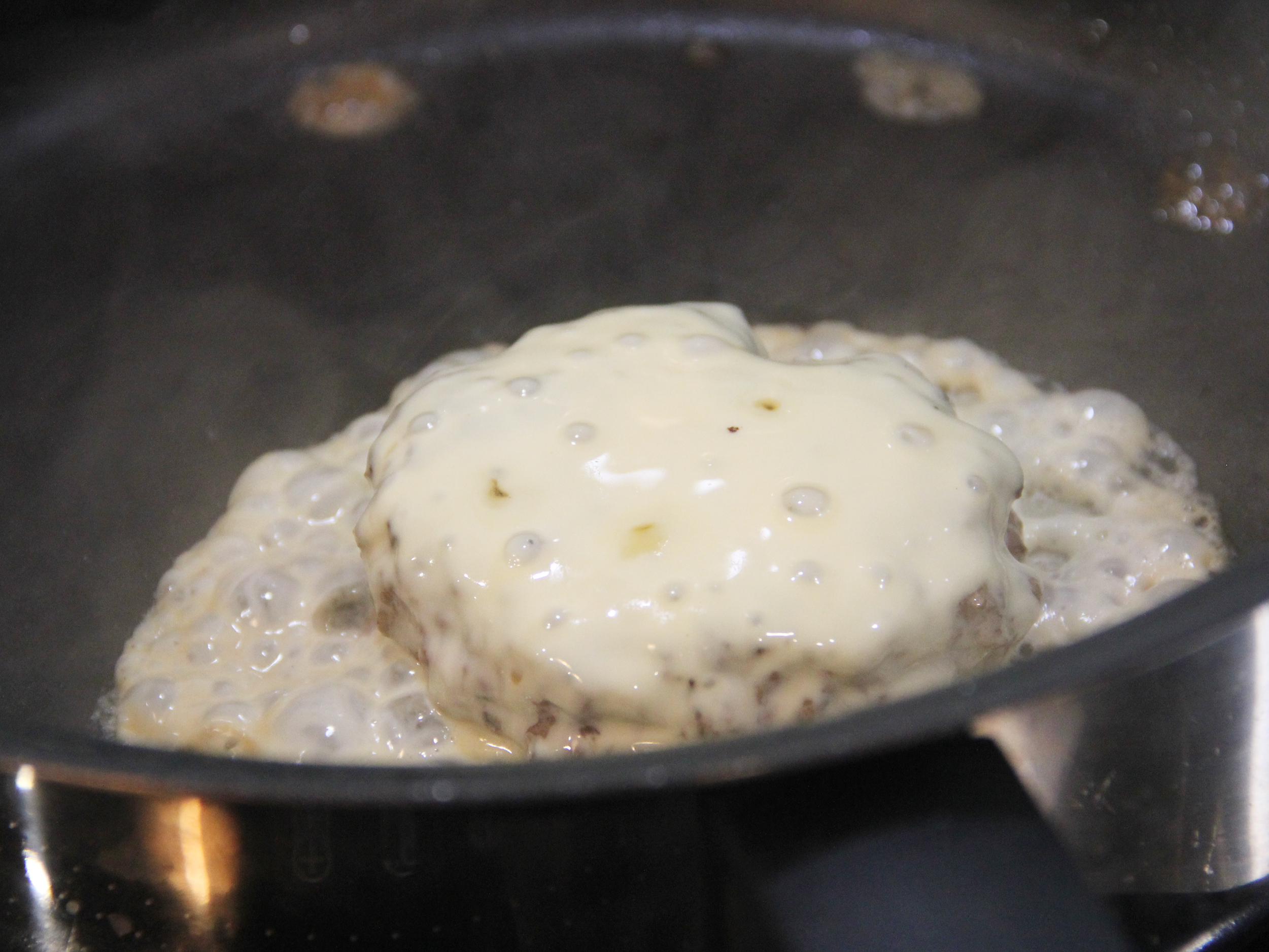 Step 5. 將漢堡排上放上起司片,在鍋內加一點說後,蓋上鍋蓋悶煮。