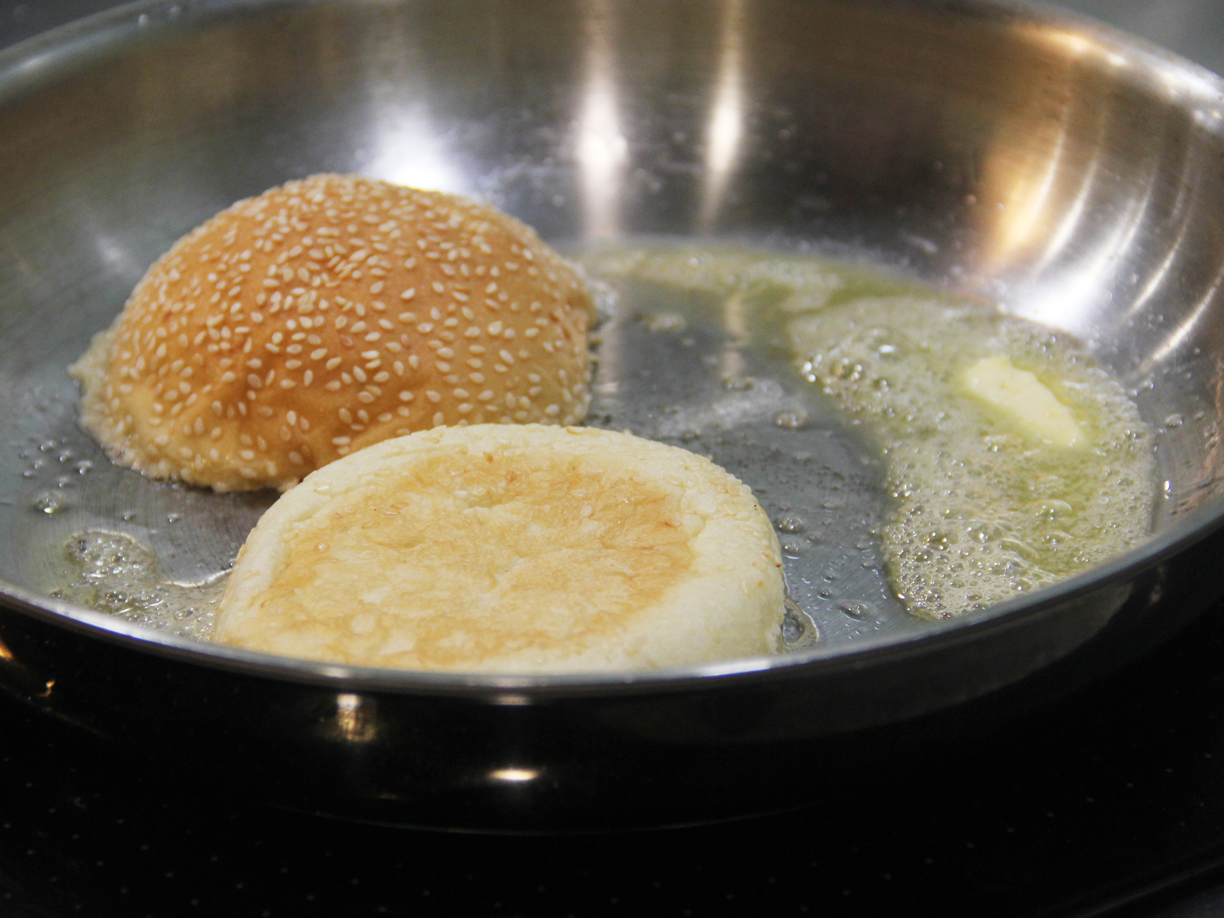 Step 6.漢堡切半,鍋內加入奶油融化後,將漢堡放入鍋內來回塗抹,直到漢堡內面變得金黃酥脆