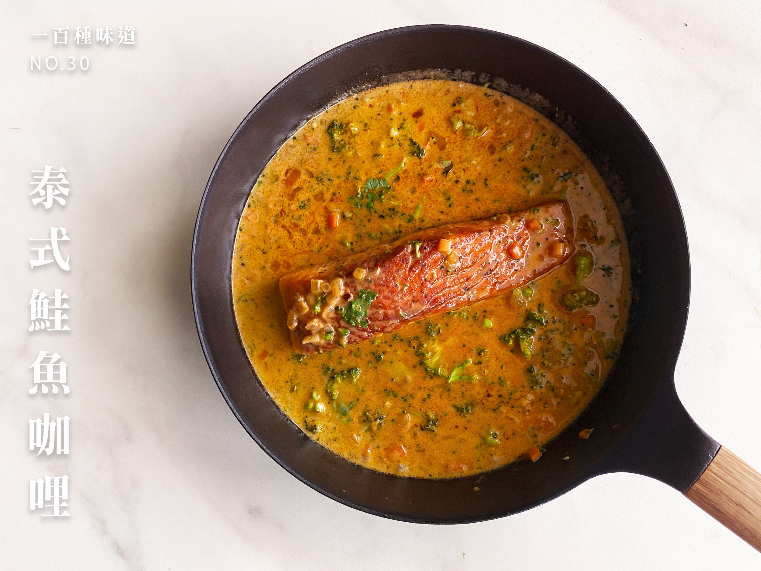 不老鮭菲力150g、奶油1小匙、洋蔥1/4顆切碎、大蒜1瓣切碎、泰國紅咖哩醬2大湯匙、胡蘿蔔1/4杯、花椰菜1/3杯、魚露1/2茶匙、全脂椰奶120g、黑糖1/2茶匙、檸檬汁1/2茶匙、新鮮香菜1茶匙切碎