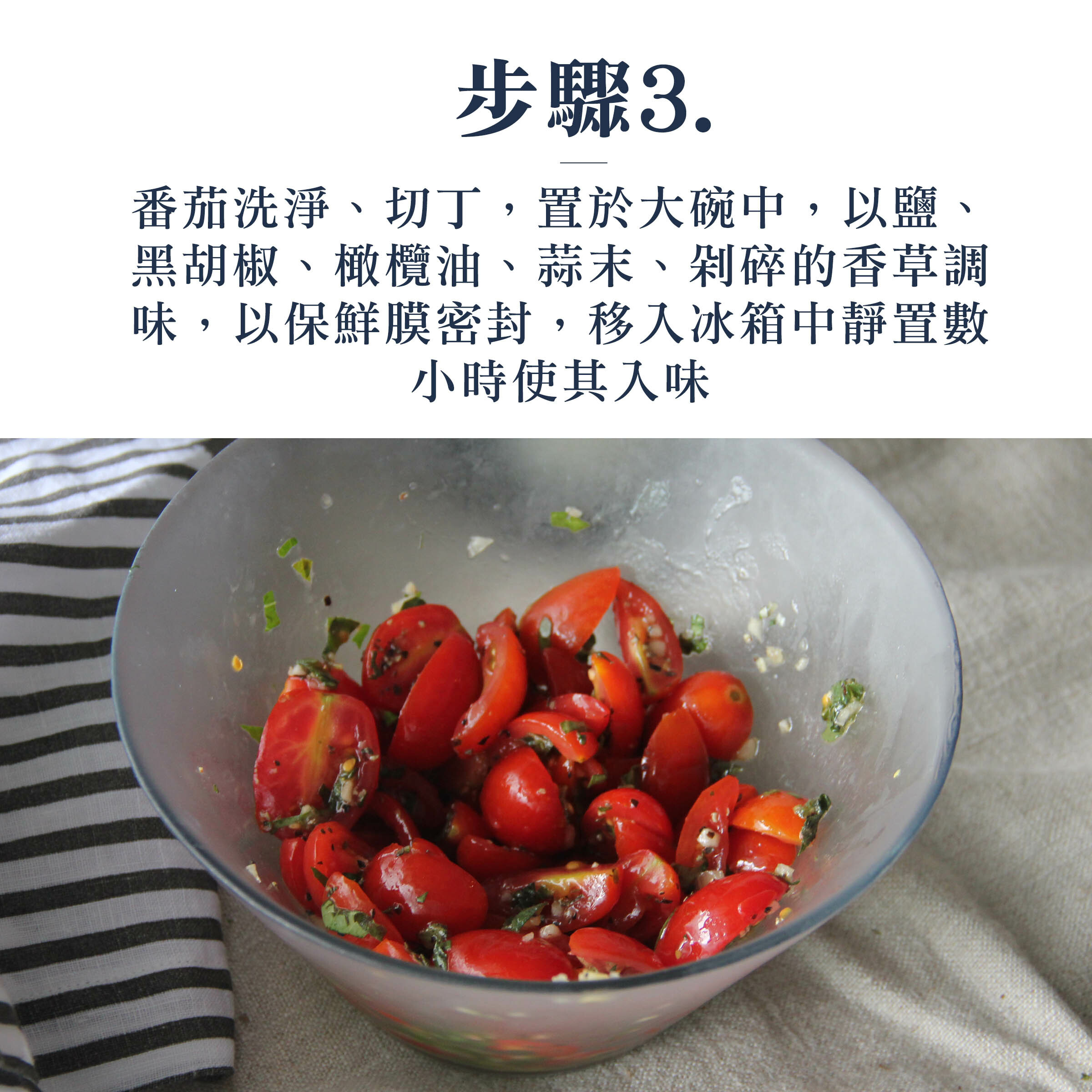 3.番茄洗淨、切丁,置於大碗中,以鹽、黑胡椒、橄欖油、蒜末、剁碎的香草調味,以保鮮膜密封,移入冰箱中靜置數小時使其入味。