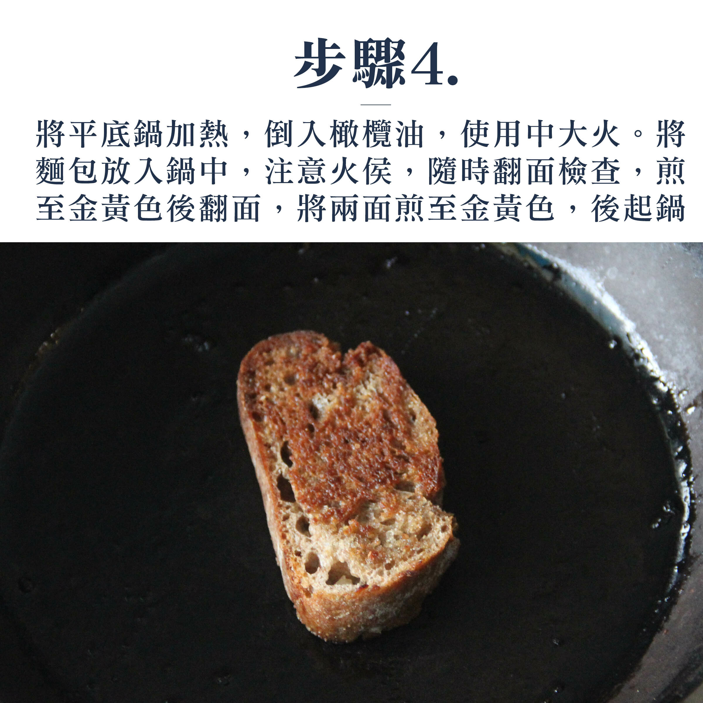 4.將平底鍋加熱,倒入橄欖油,使用中大火。將麵包放入鍋中,注意火侯,隨時翻面檢查,煎至金黃色後翻面,將兩面煎至金黃色,後起鍋