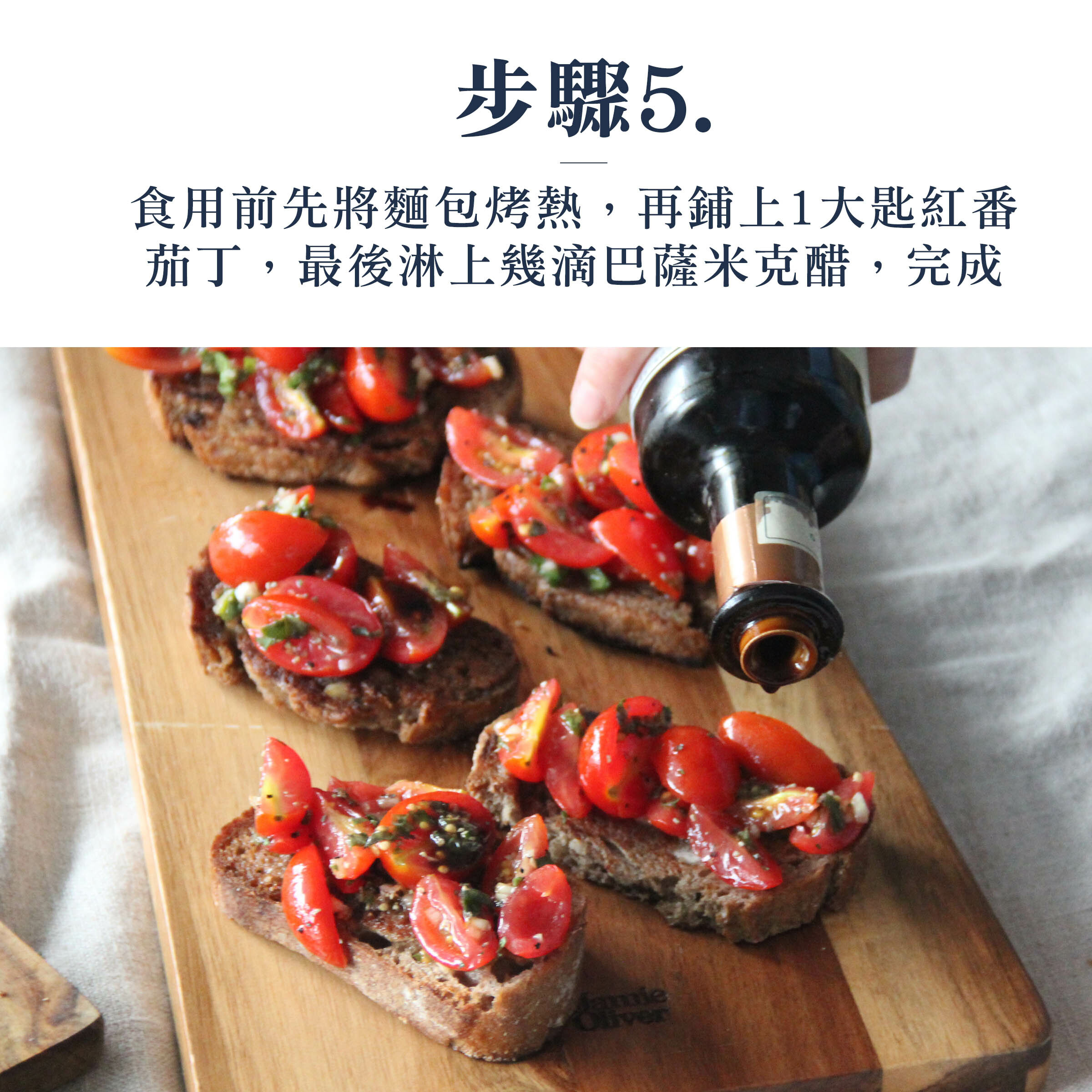 5、食用前先將麵包烤熱,再鋪上1大匙紅番茄丁,最後淋上幾滴巴薩米克醋,完成