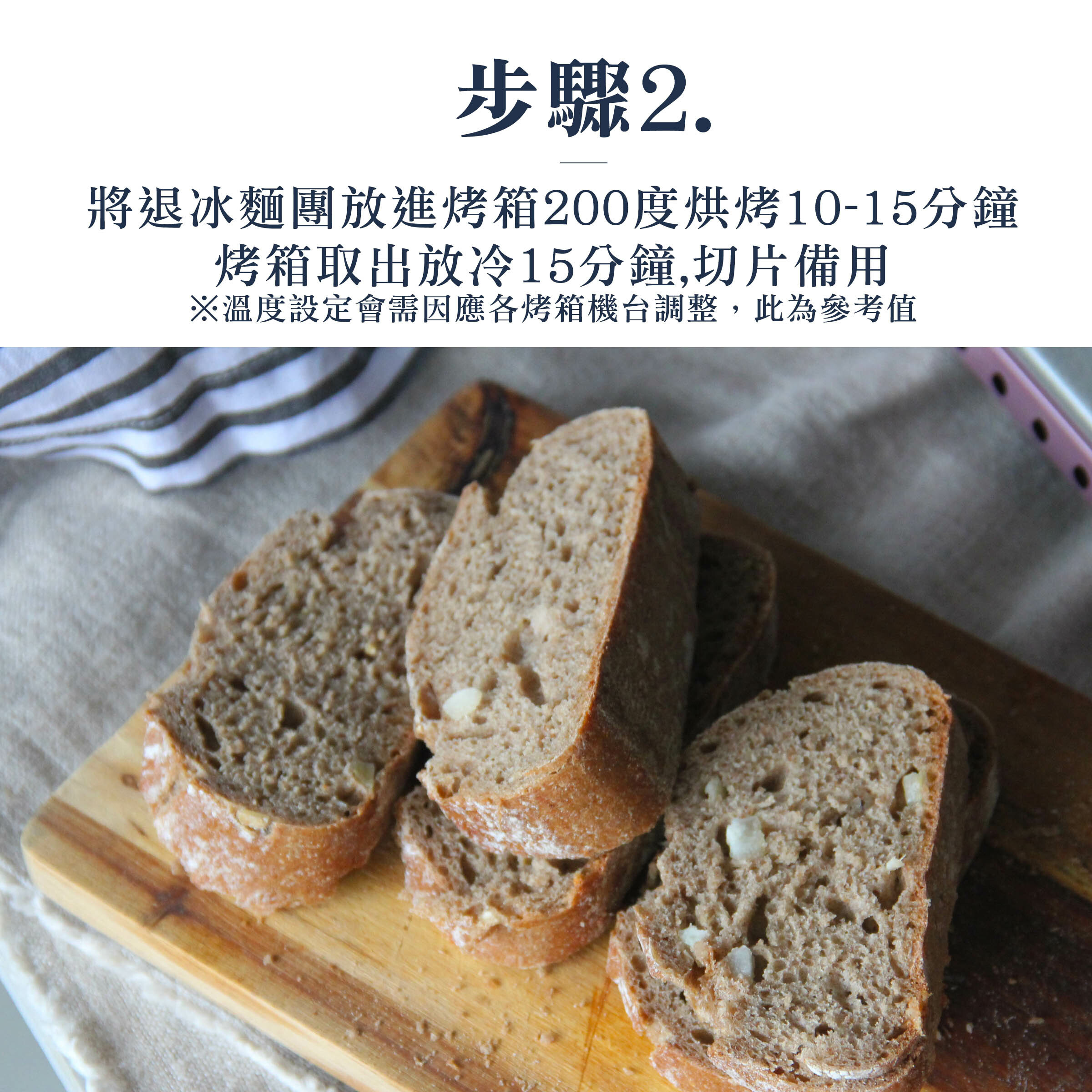 2.將退冰麵包放進烤箱 200 度烘烤 10-15 分鐘,烤箱取出放冷 15 分鐘,,切片備用