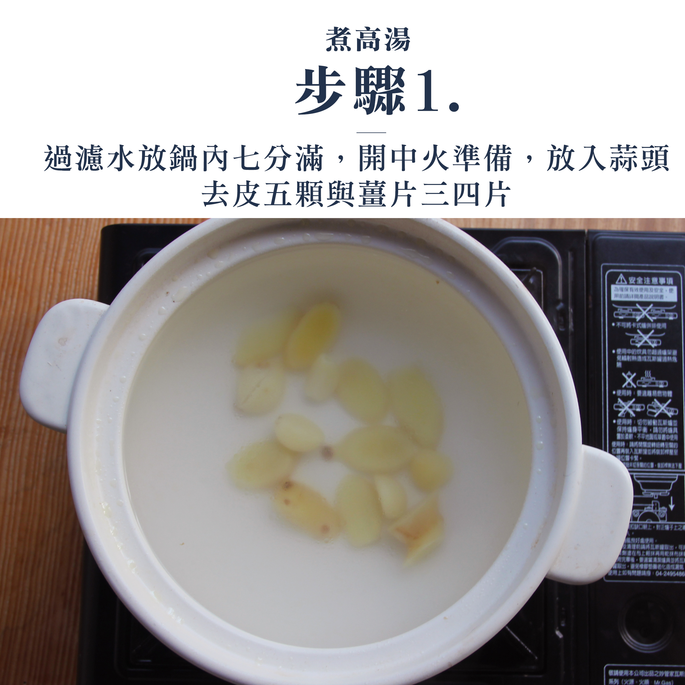 過濾水放鍋內七分滿,開中火準備,放入蒜頭去皮五顆與薑片三四片。