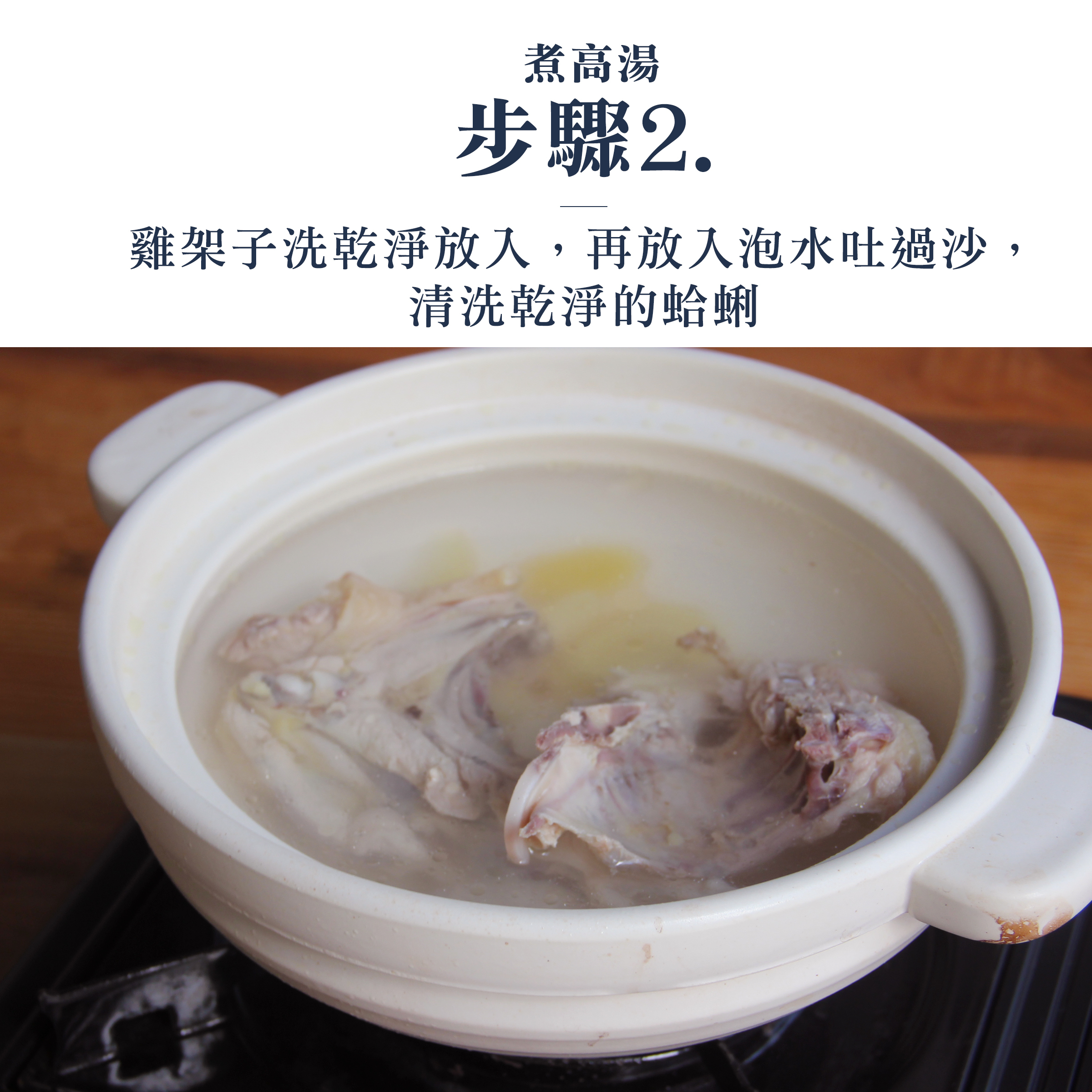 雞架子洗乾淨放入,再放入泡水吐過沙,清洗乾淨的蛤蜊。
