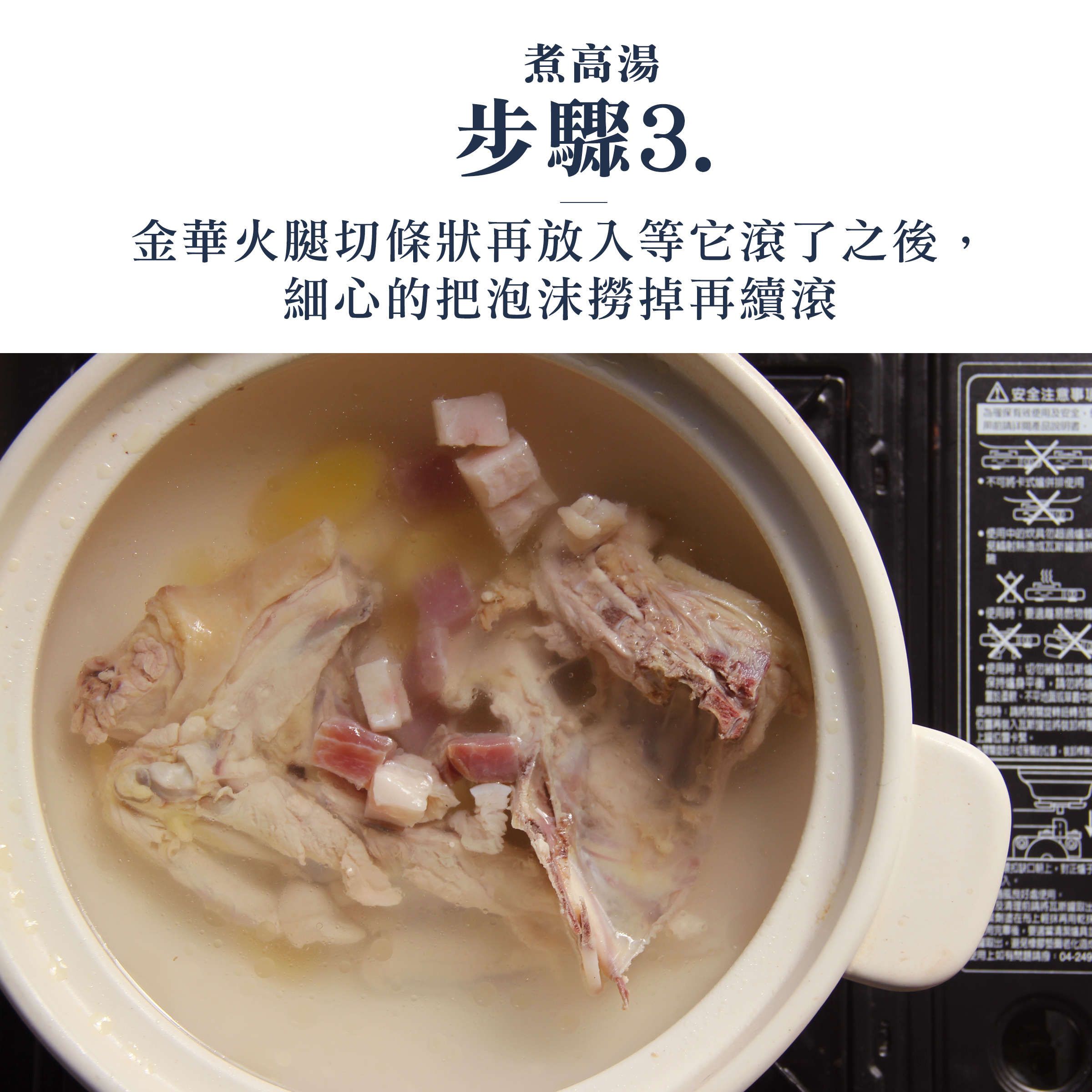 金華火腿切條狀再放入等它滾了之後,細心的把泡沫撈掉再續滾。