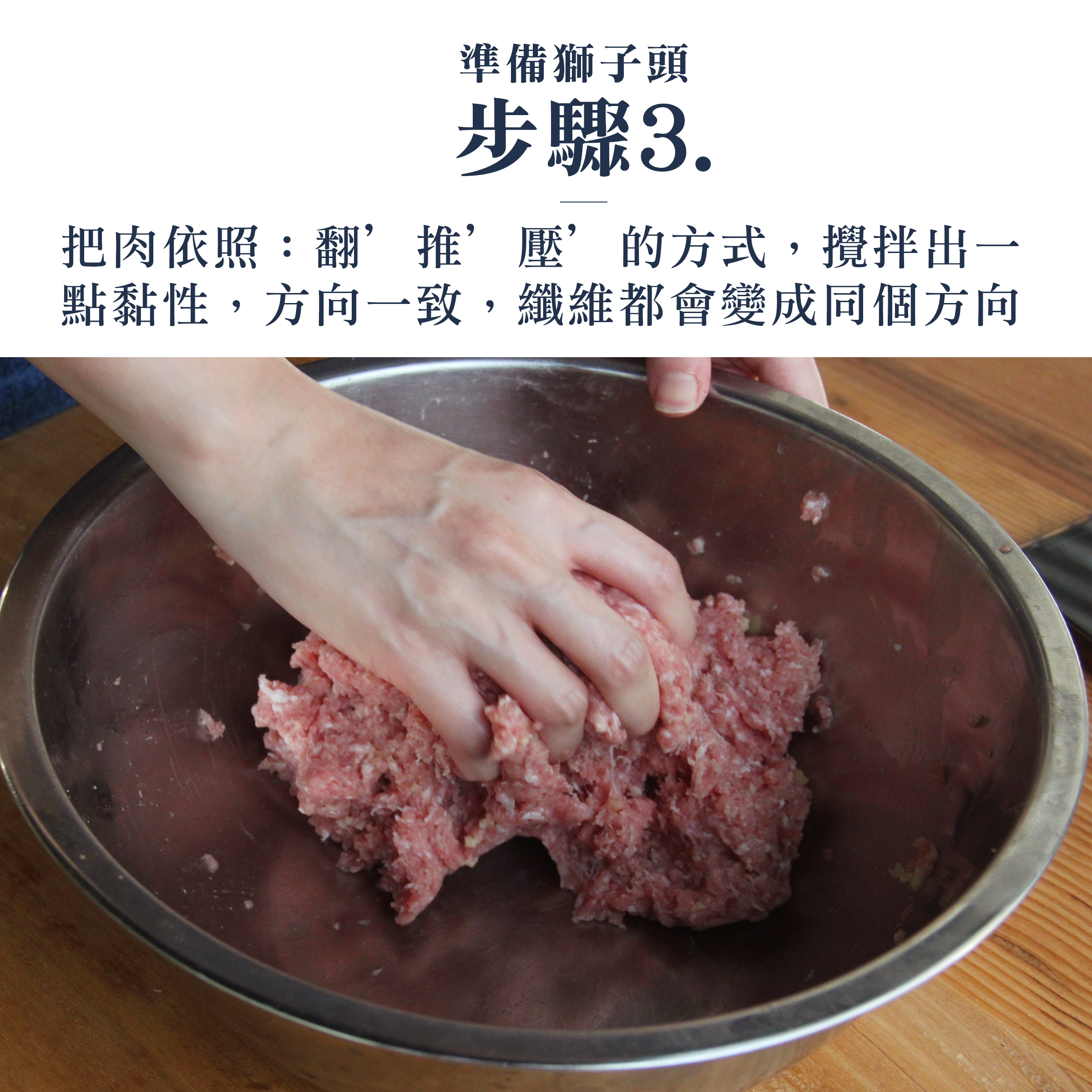 把肉依照:翻’推’壓’的方式,攪拌出一點黏性,方向一致,纖維都會變成同個方向。