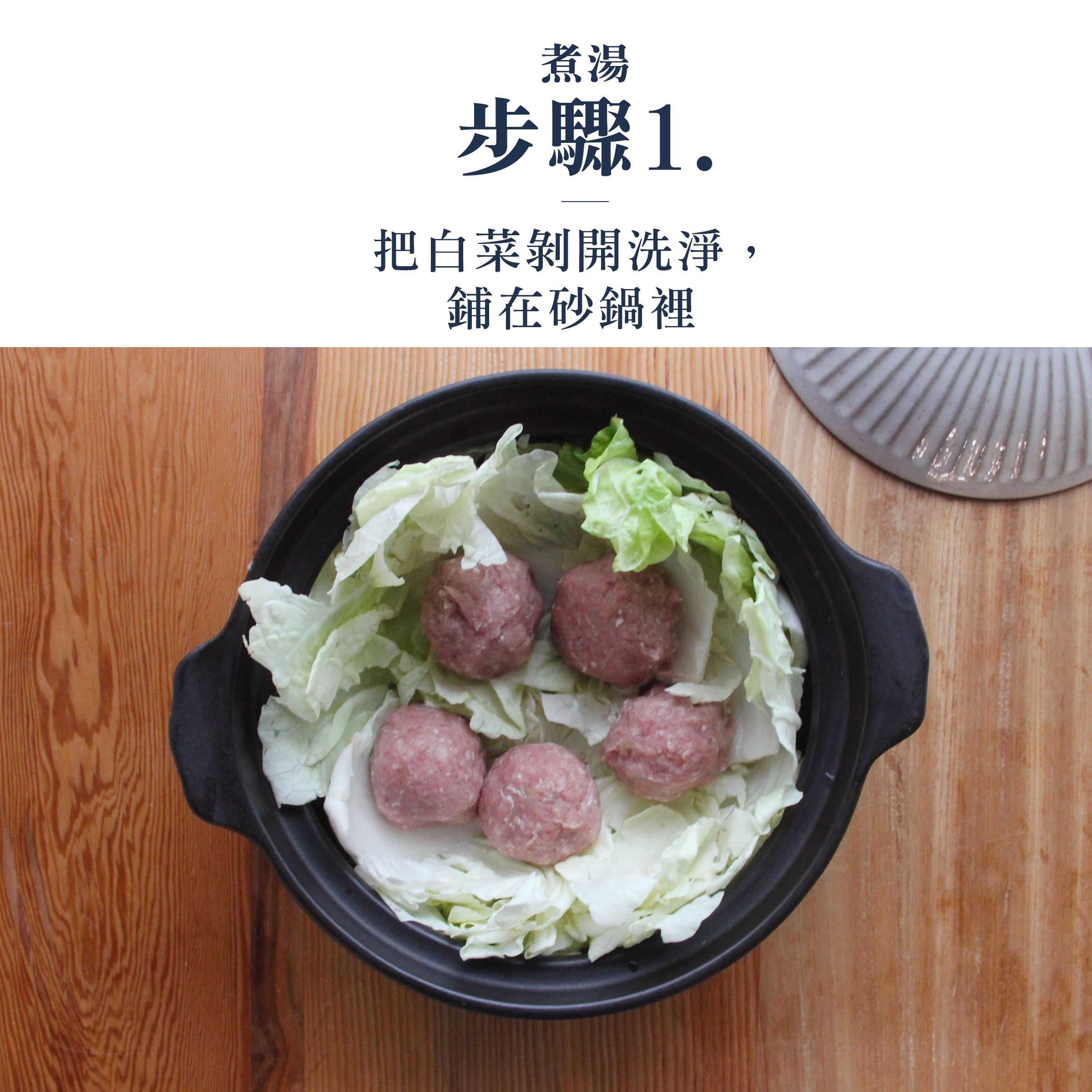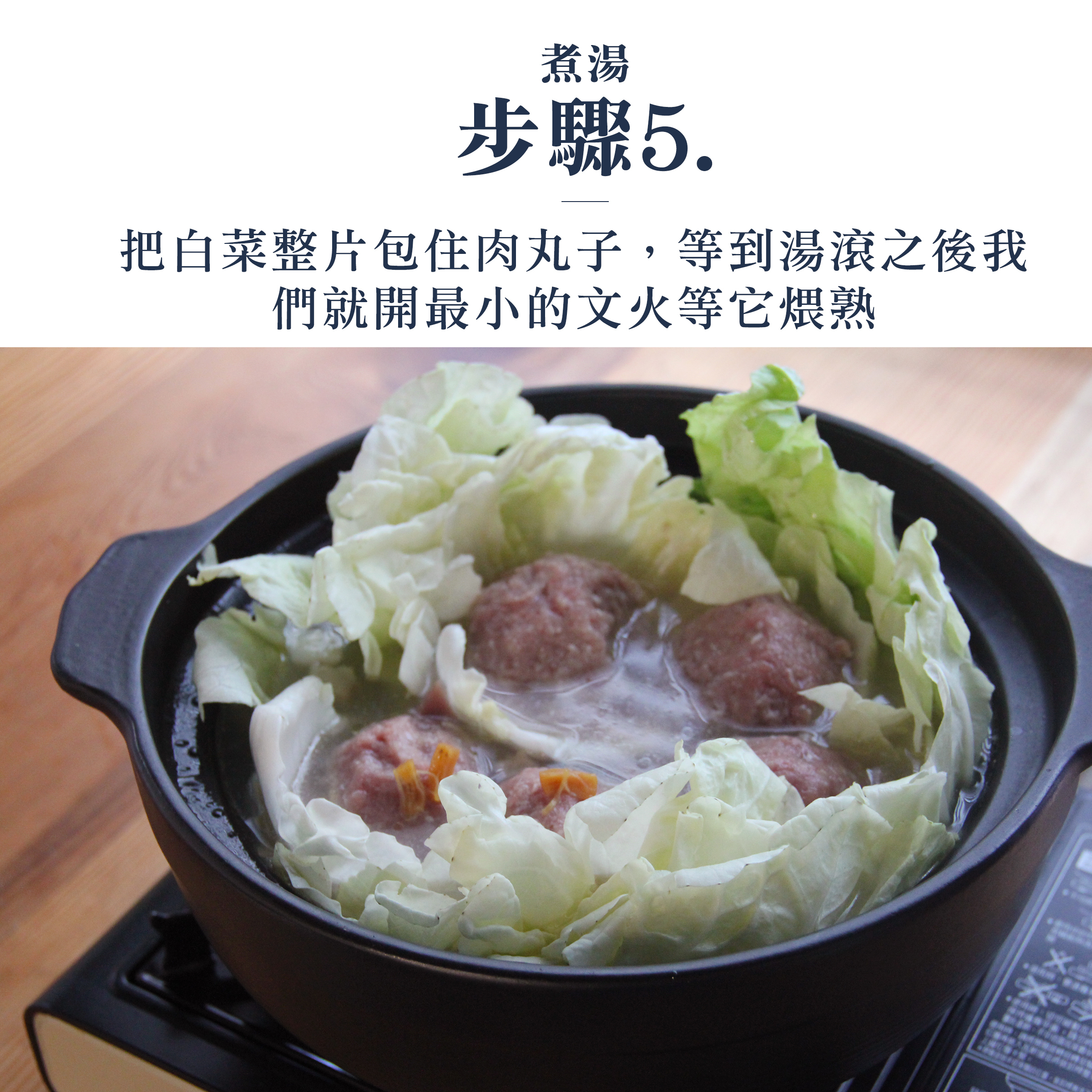 把白菜整片包住肉丸子,等到湯滾之後我們就開最小的文火等它煨熟。