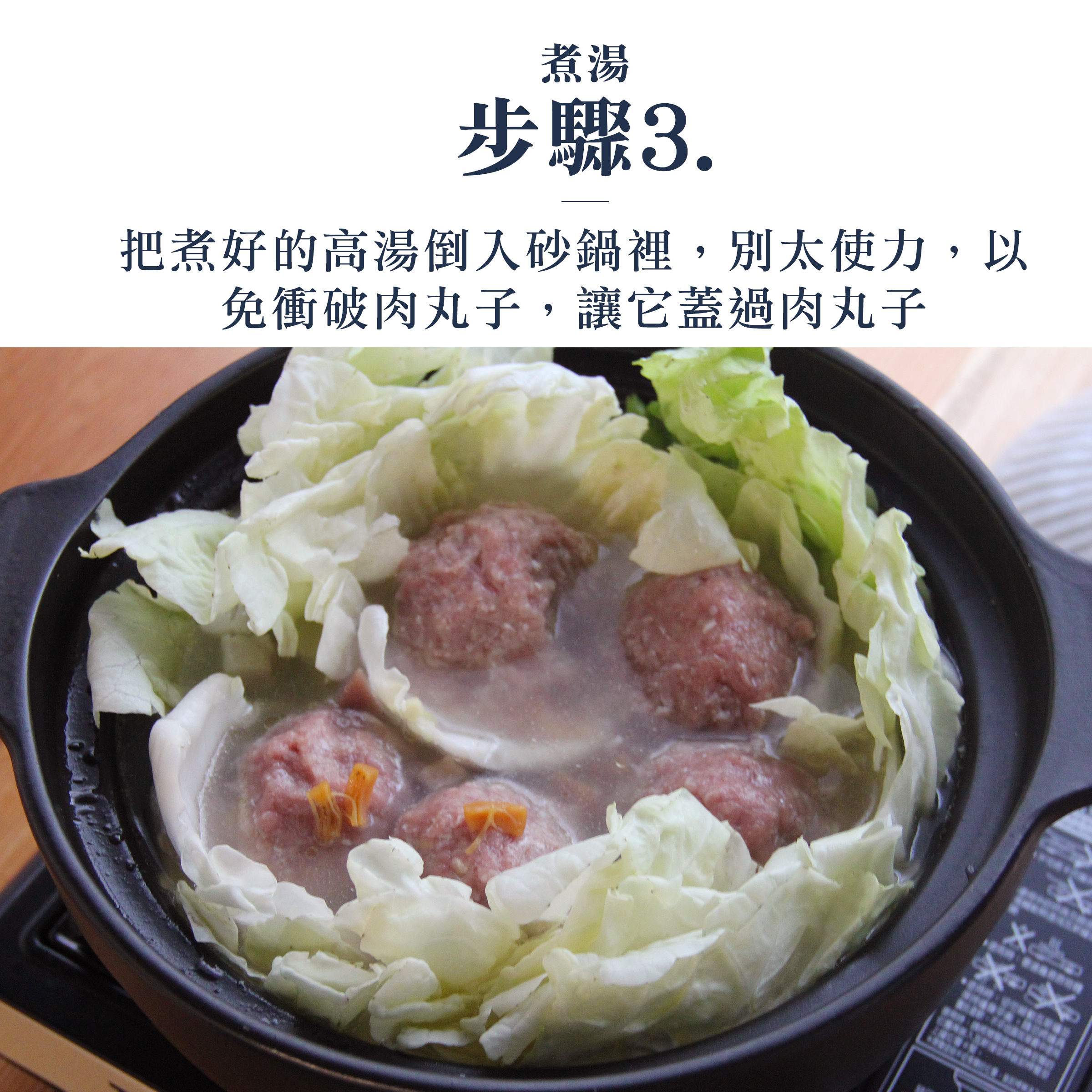 把煮好的高湯倒入砂鍋裡,別太使力,以免衝破肉丸子,讓它蓋過肉丸子。