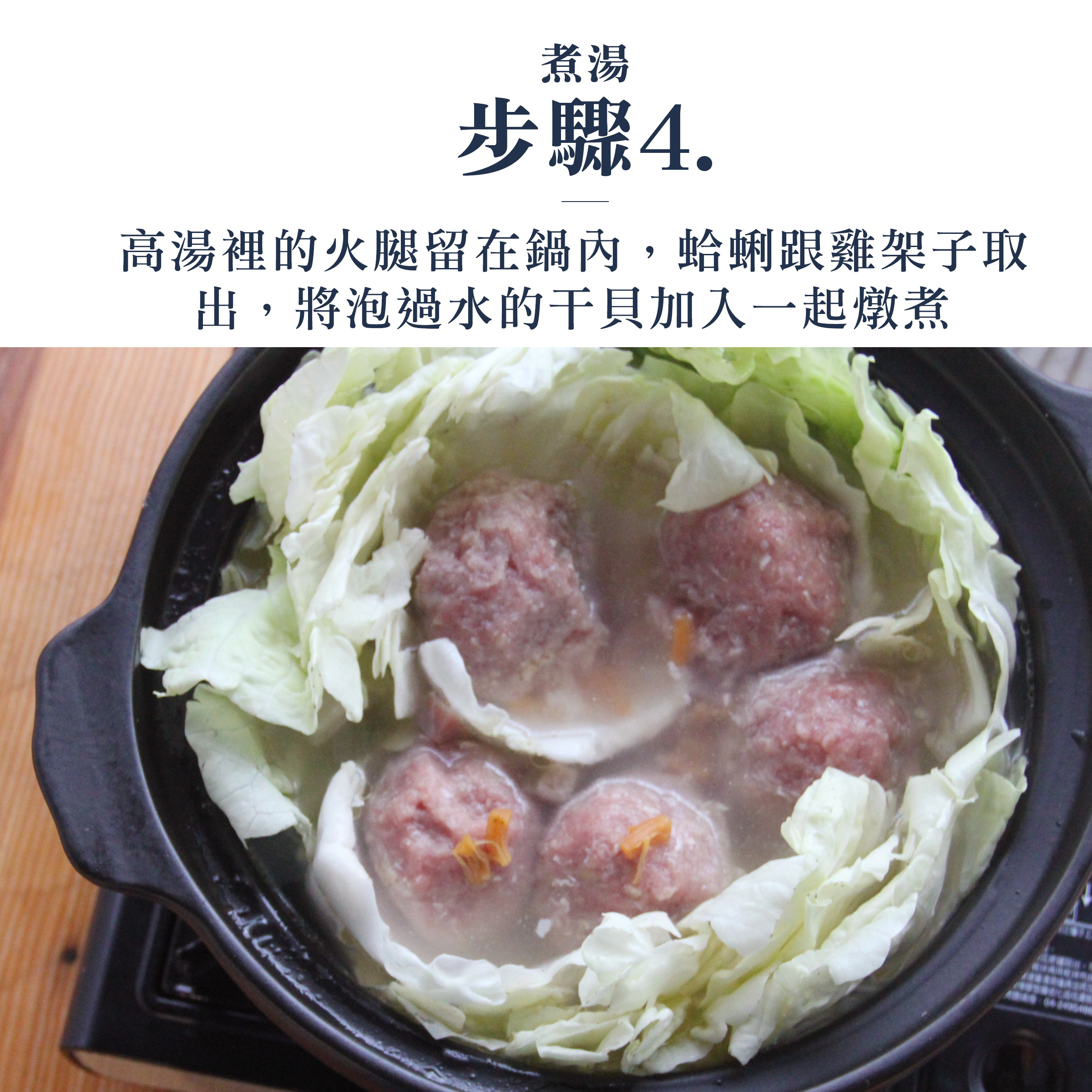 高湯裡的火腿留在鍋內,蛤蜊跟雞架子取出,將泡過水的干貝加入一起燉煮