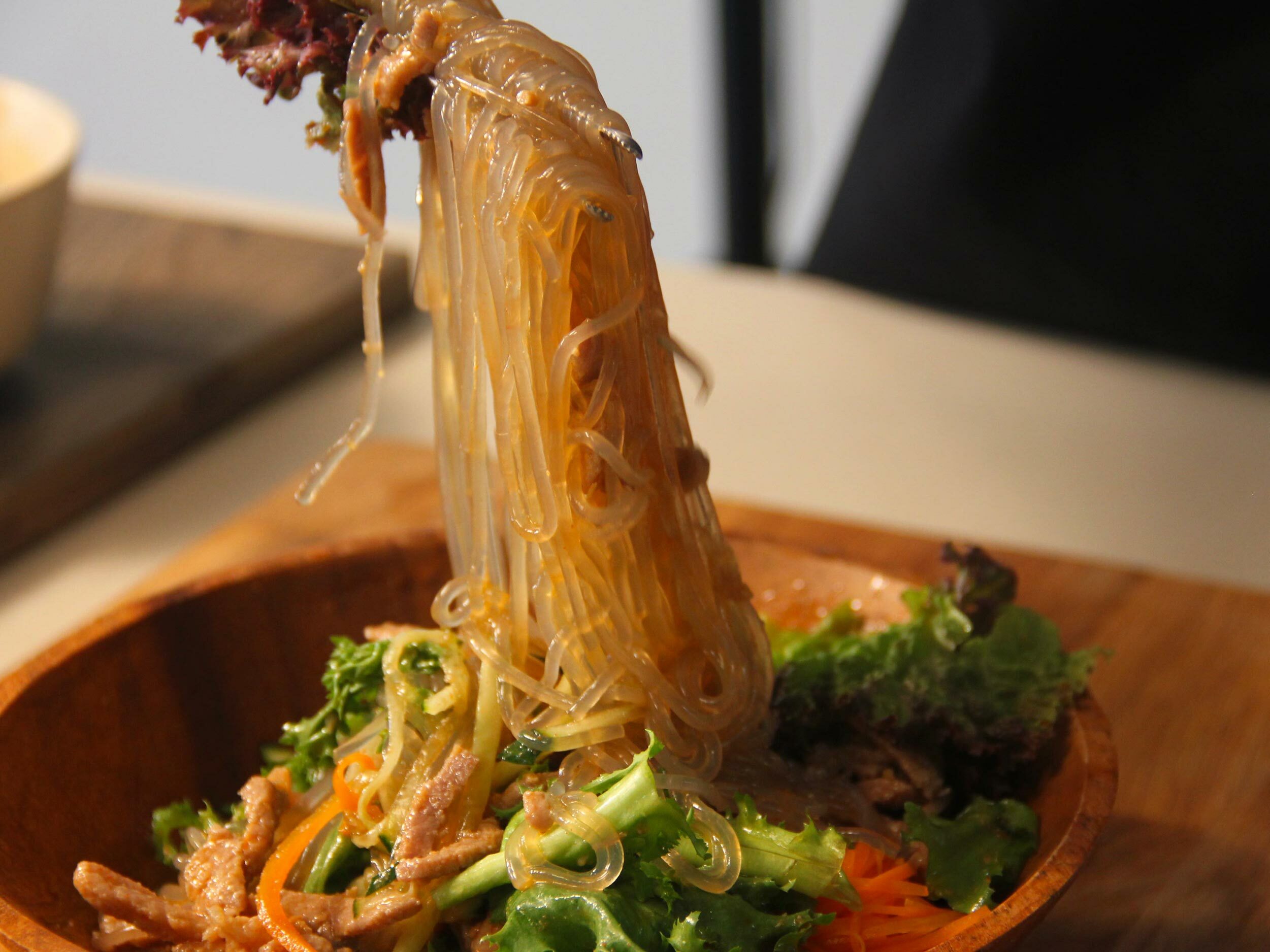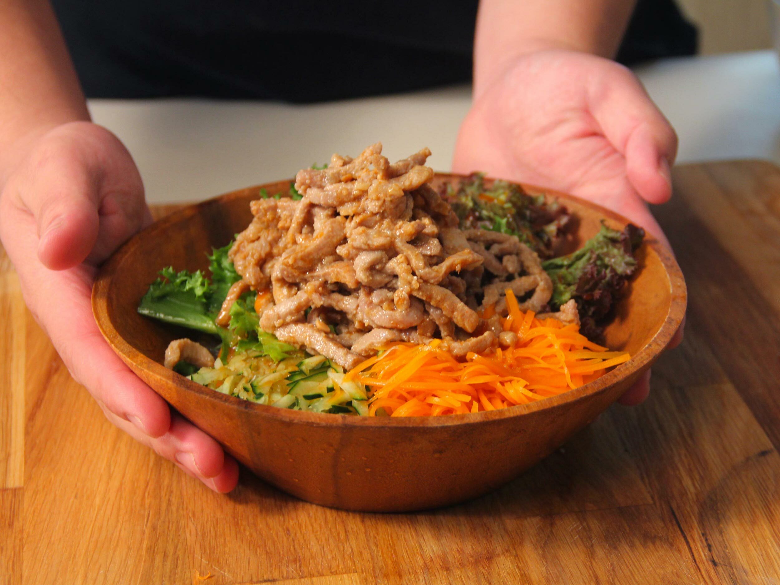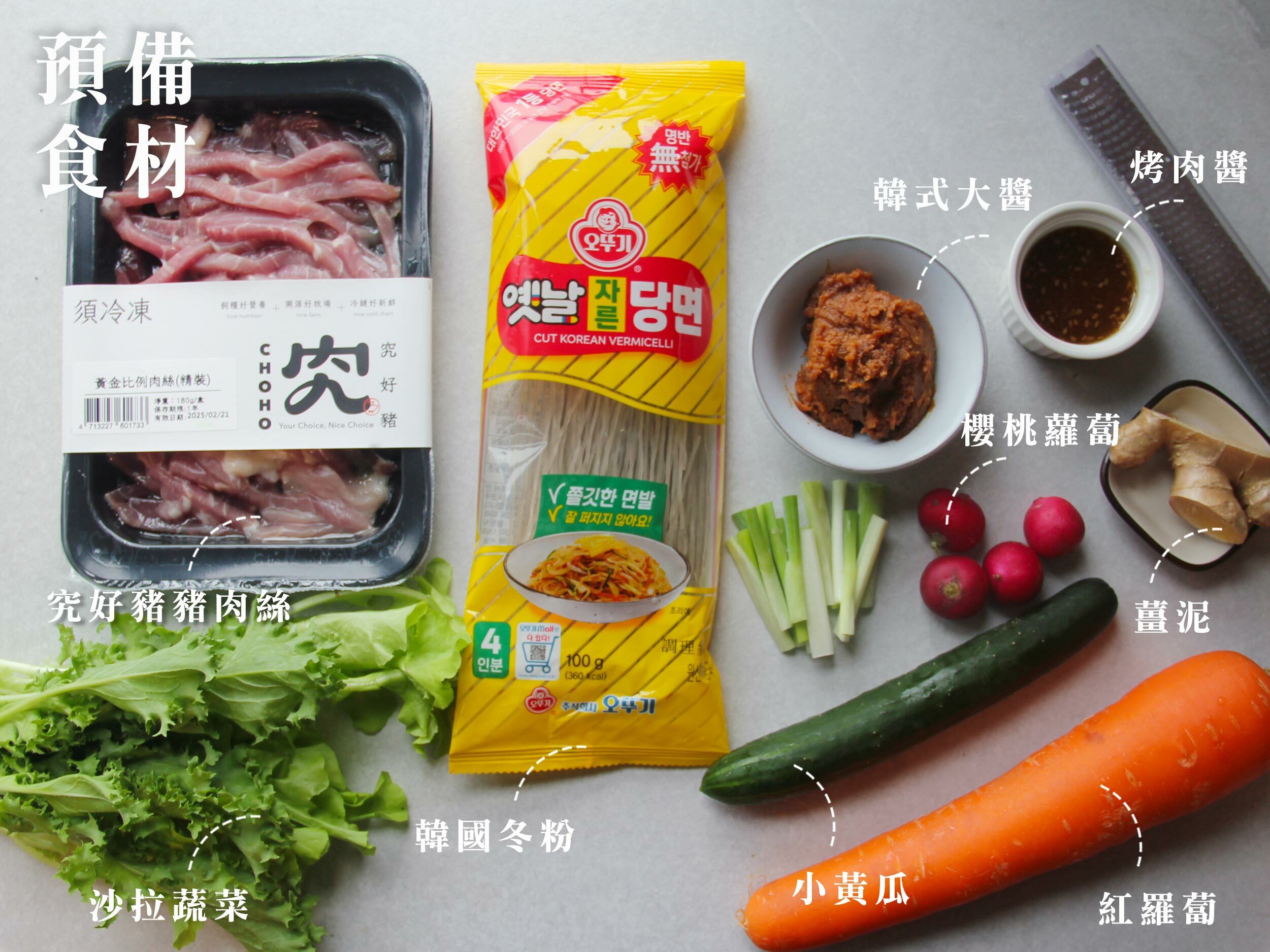 6.組裝冬粉、蔬菜,豬肉,淋上沙拉醬汁