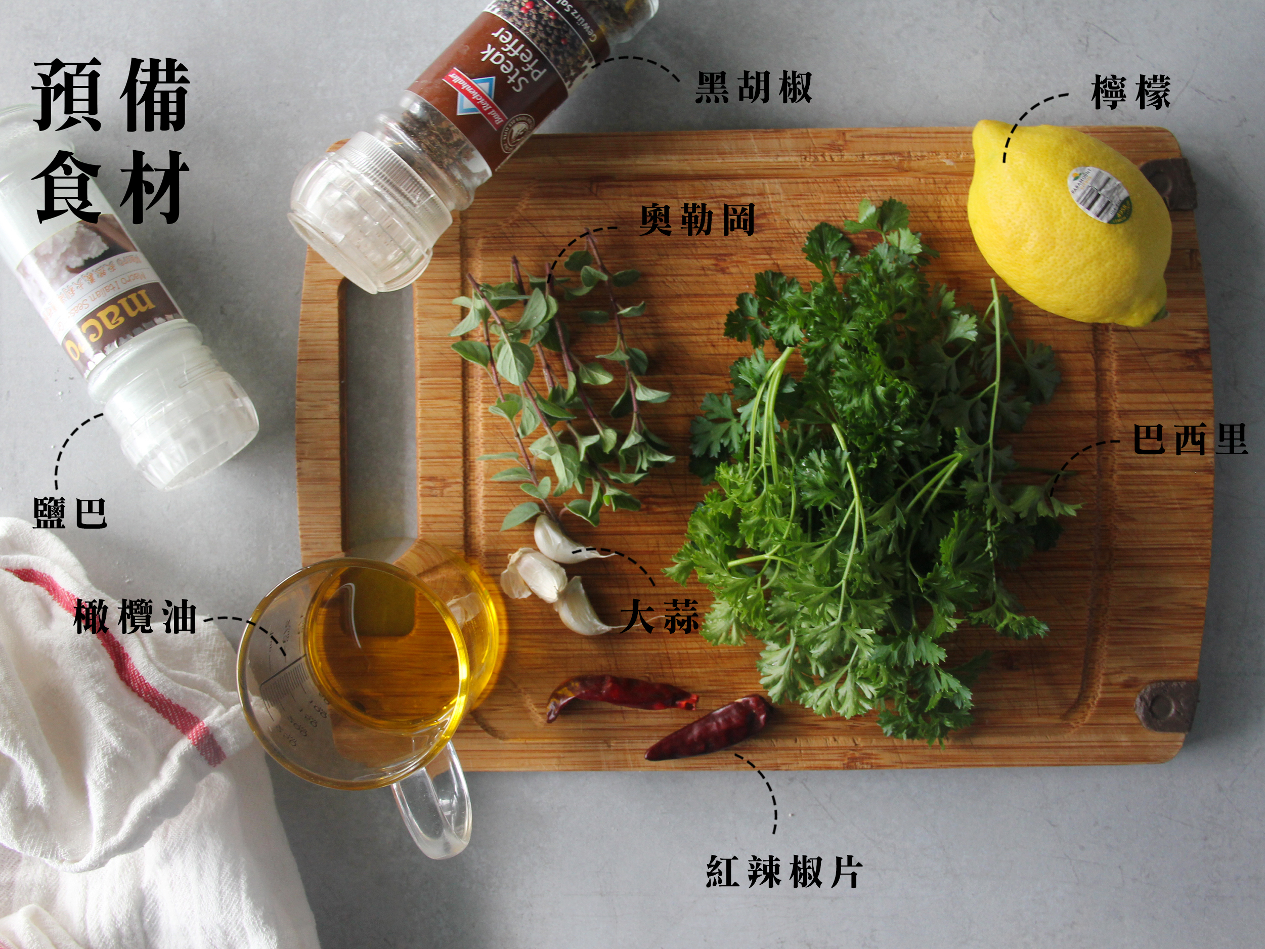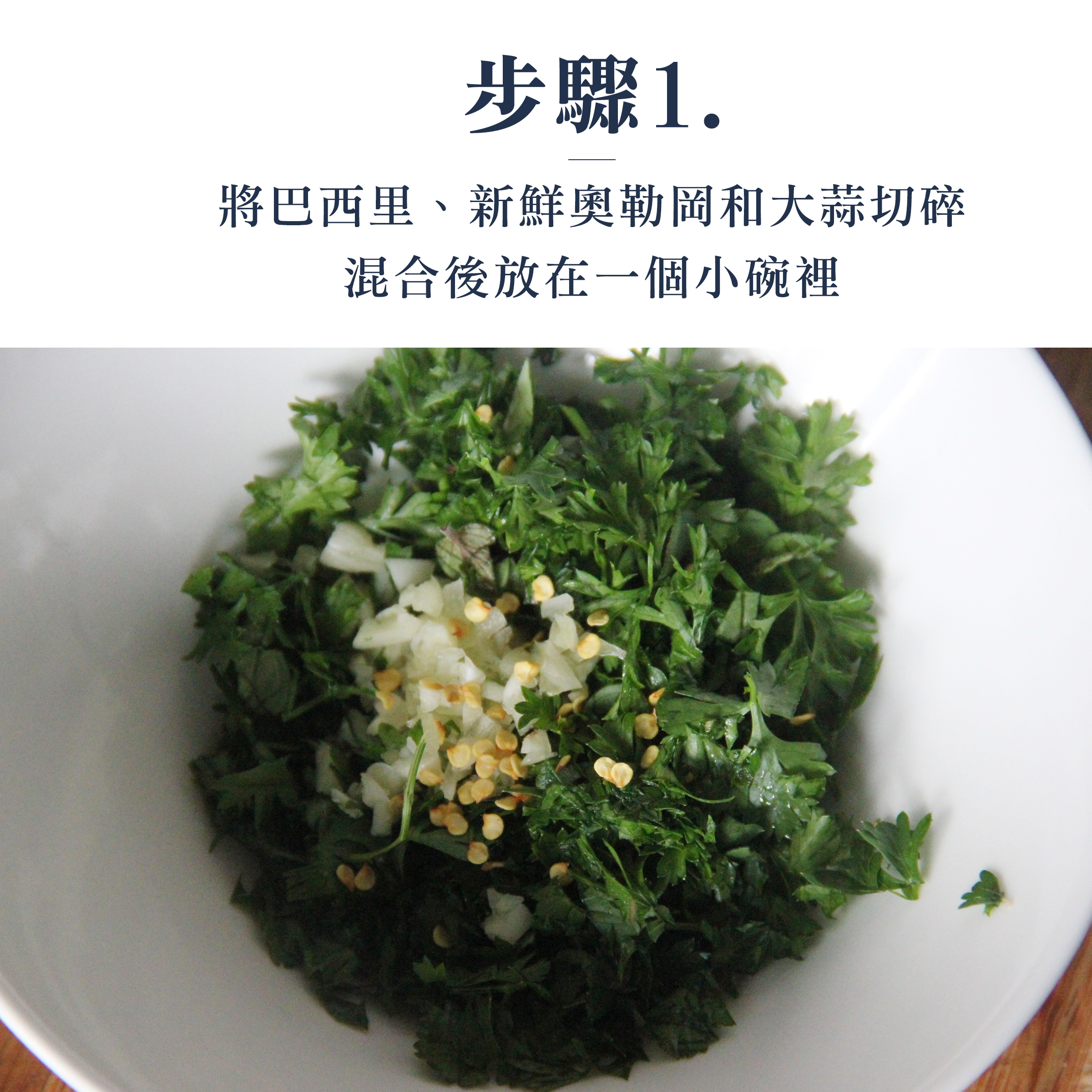 1.將巴西里、新鮮奧勒岡和大蒜切碎(可用食物調理機)。混合後放在一個小碗裡。