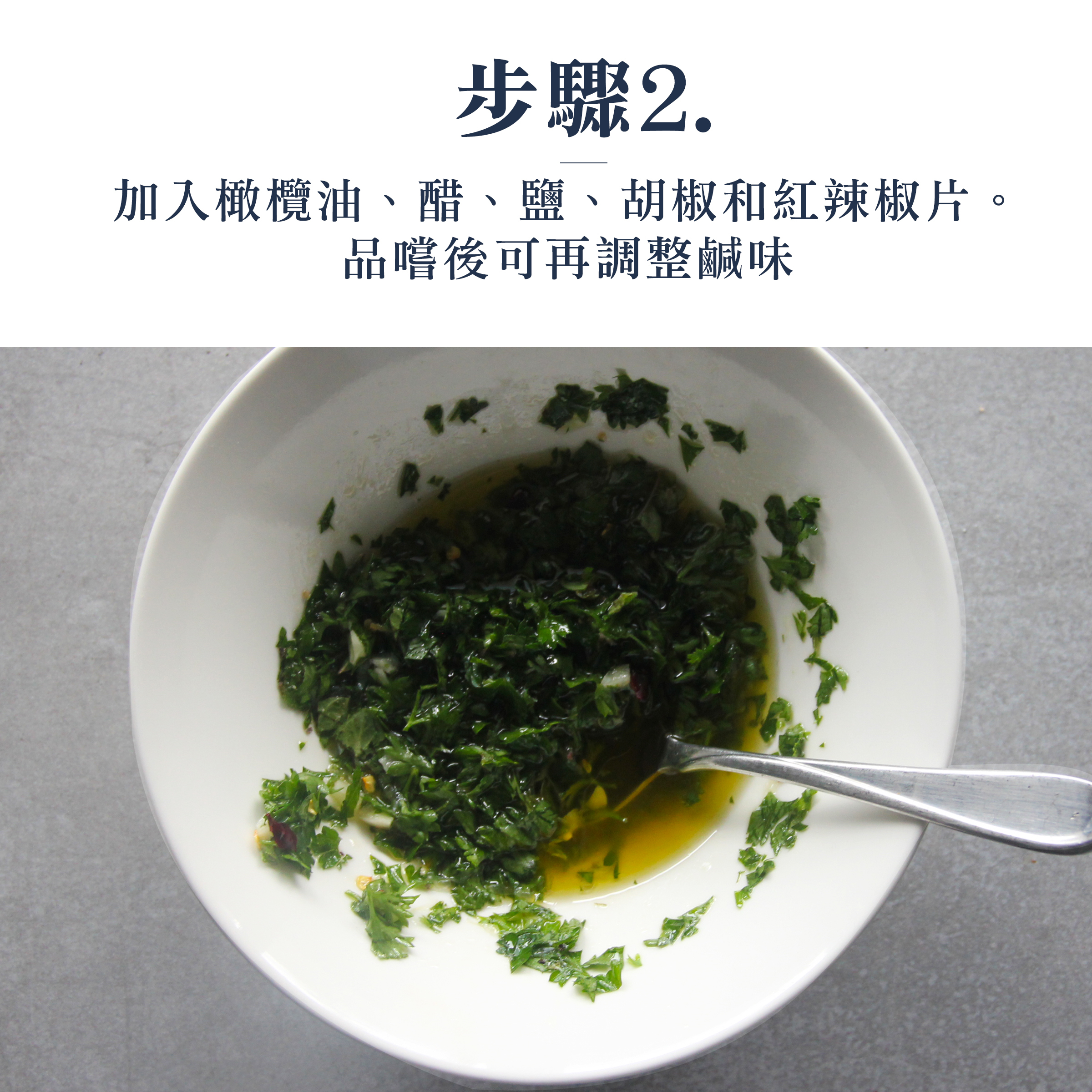 阿根廷青醬的香草香和酸勁,非常適合搭配肉類燒烤料理,豬肉或雞肉、魚肉都能成為畫龍點睛的一筆,拿來拌沙拉或義大利麵也甚是清爽。