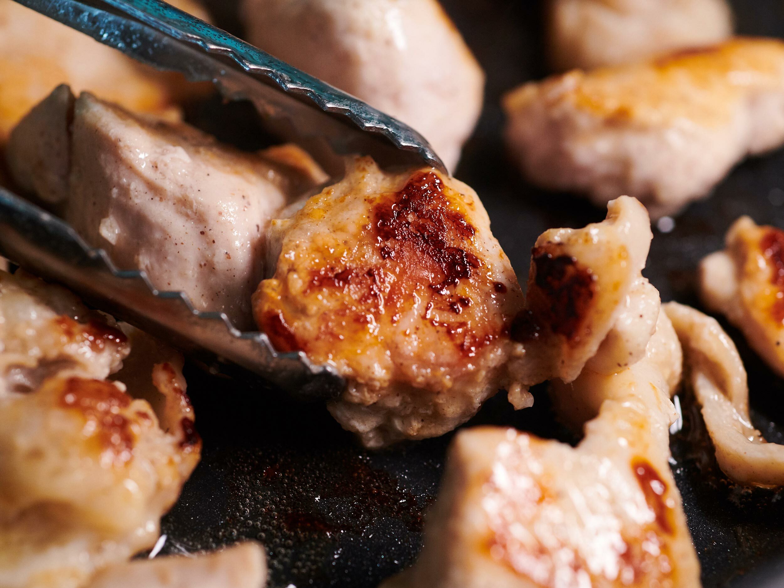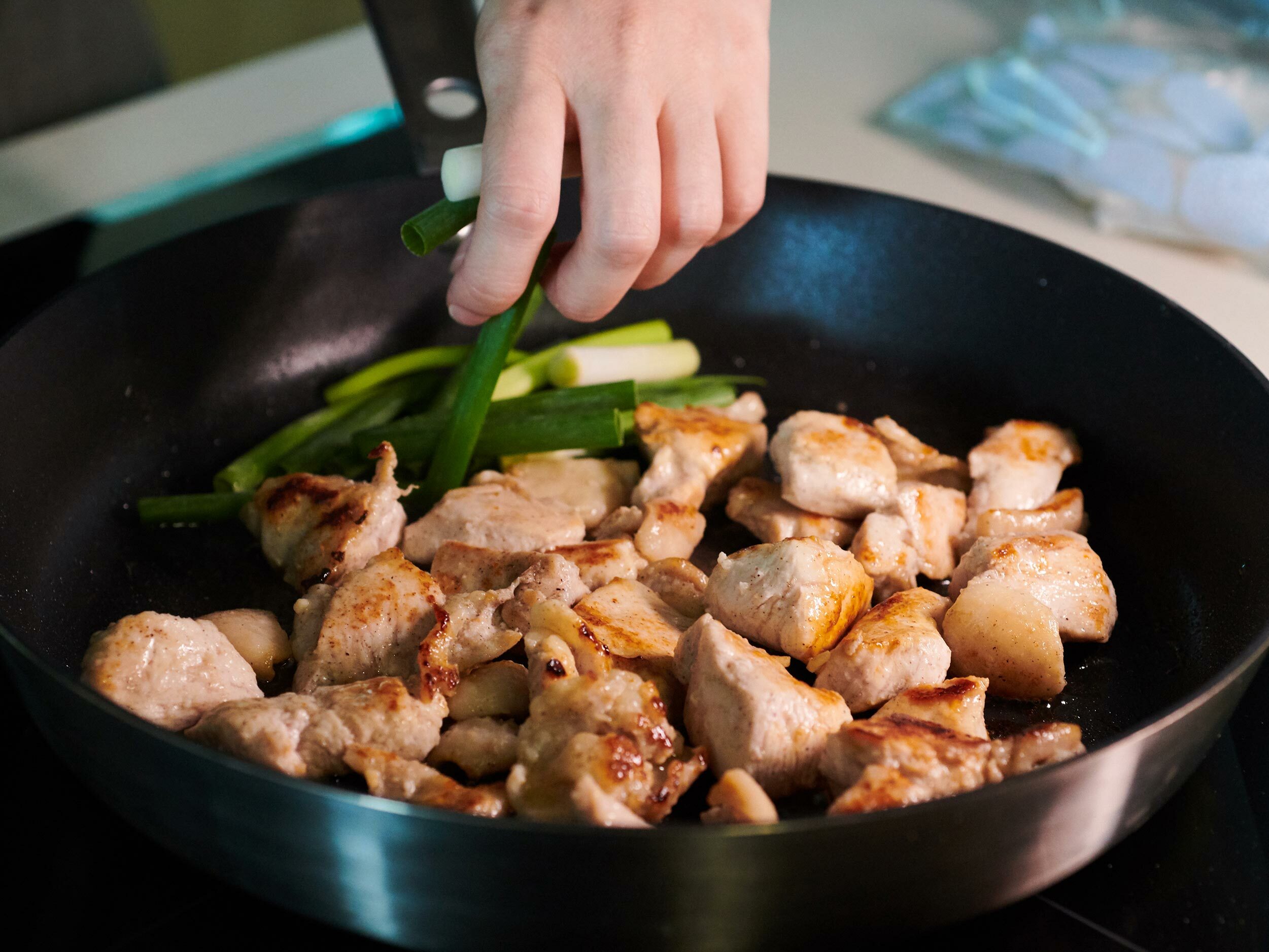 3.將雞肉和調味料一起放入平底鍋裡以中火加熱