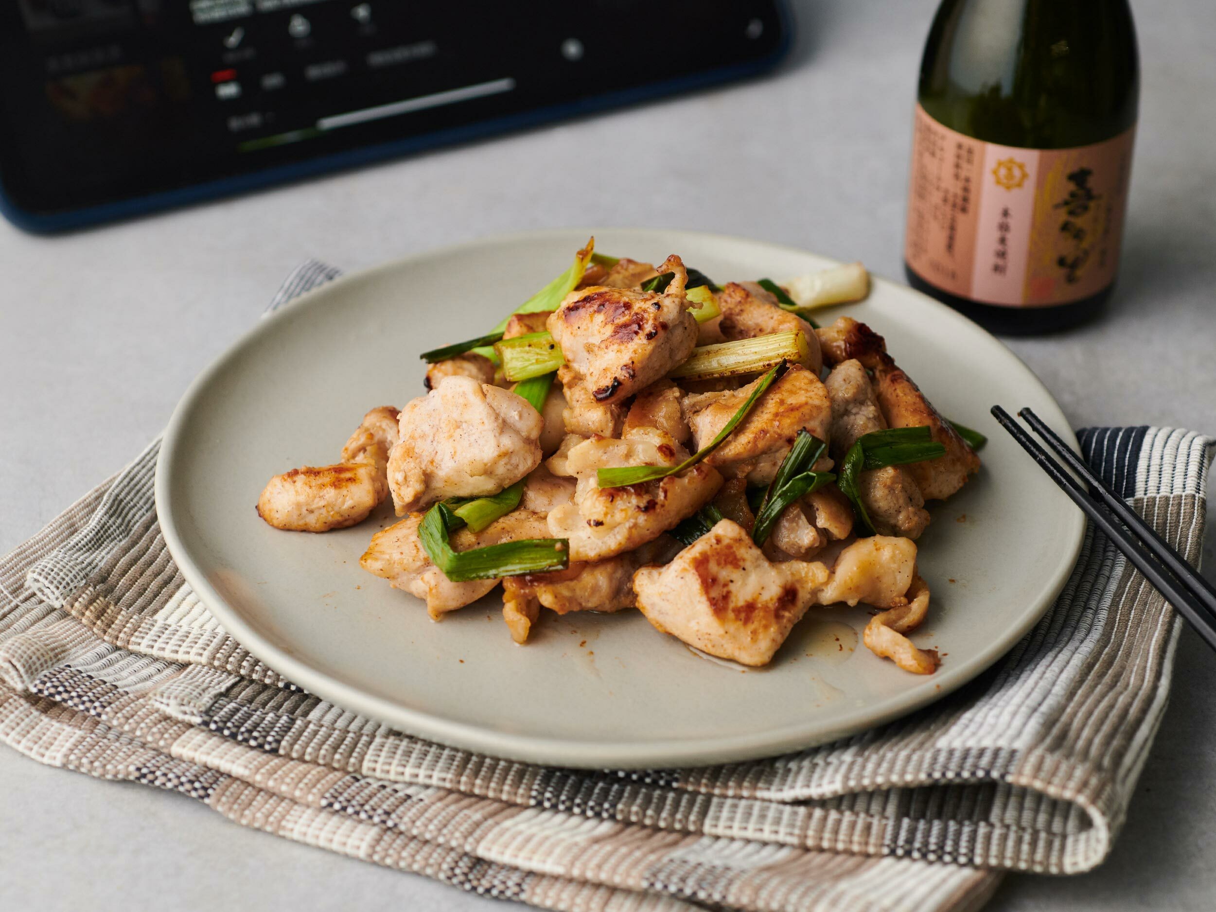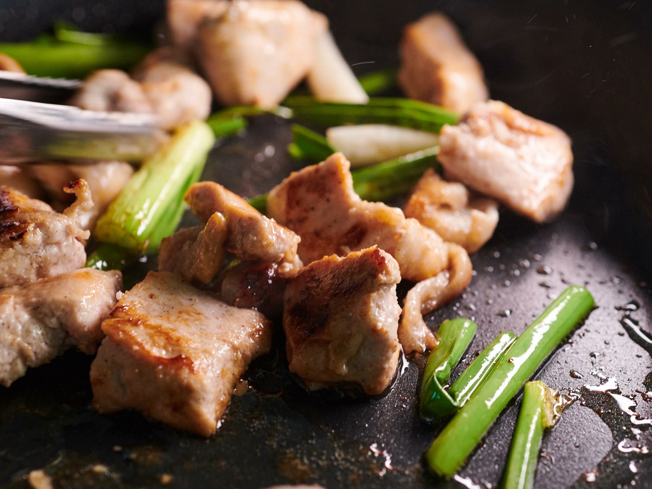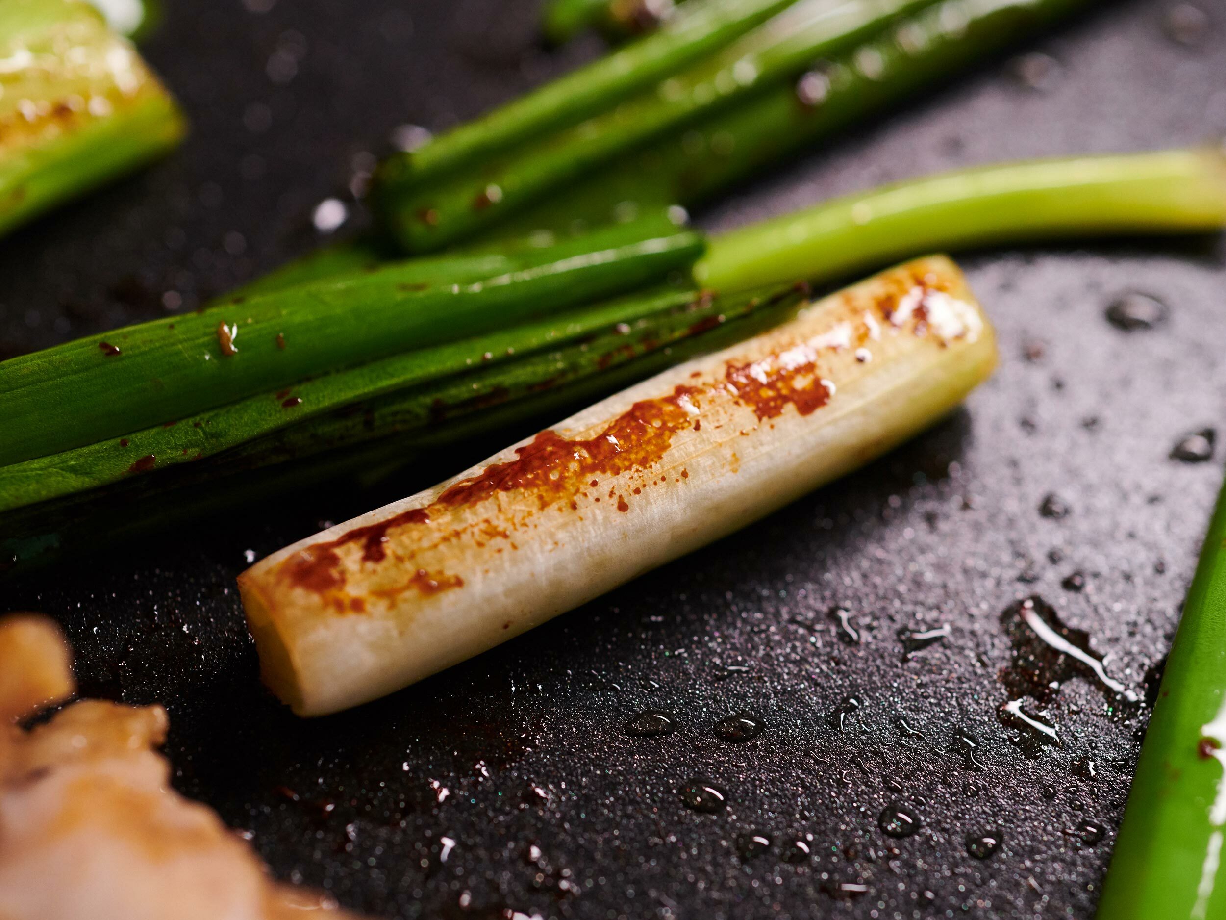 5.之後把雞肉往鍋邊靠,空出地方放入青蔥