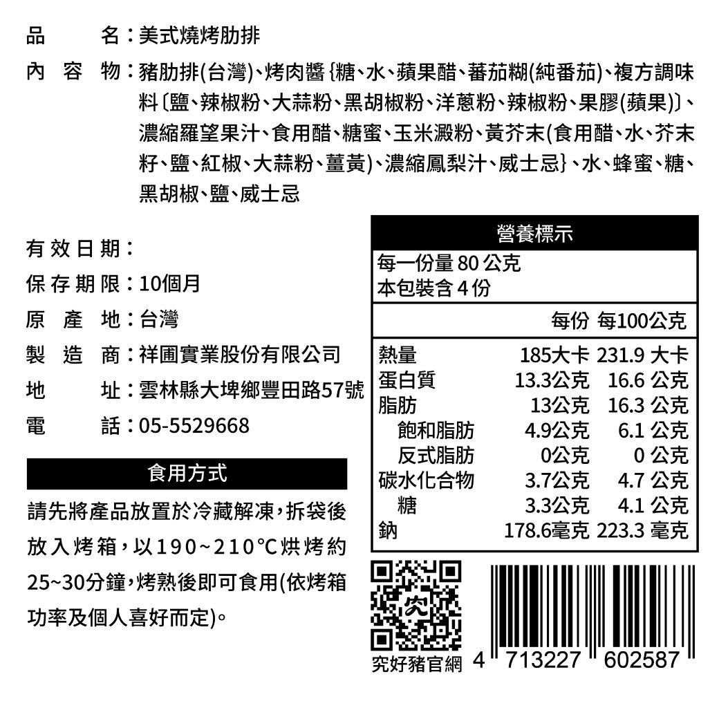 ■ 內容物名稱(成分):豬肋排(台灣)、烤肉醬{糖、水、蘋果醋、蕃茄糊(純番茄)、複方調味料[鹽、辣椒粉、大蒜粉、黑胡椒粉、洋蔥粉、辣椒粉、果膠(蘋果)]、濃縮羅望果汁、食用醋、糖蜜、玉米澱澱粉、黃芥末(食用醋、水、芥末籽、鹽、紅椒、大蒜粉、薑黃)、濃縮鳳梨汁、威士忌}、水、蜂蜜、糖、黑胡椒、鹽、威士忌