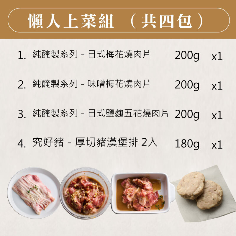 ■ 成分:究好豬五花肉片(台灣)、鹽麴(蓬萊米、水、鹽、釀造酒精)、蒜泥