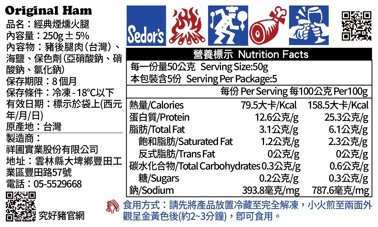 ■ 成分:豬後腿肉(台灣)、海鹽、保色劑(亞硝酸鈉、硝酸鈉、氯化鈉)