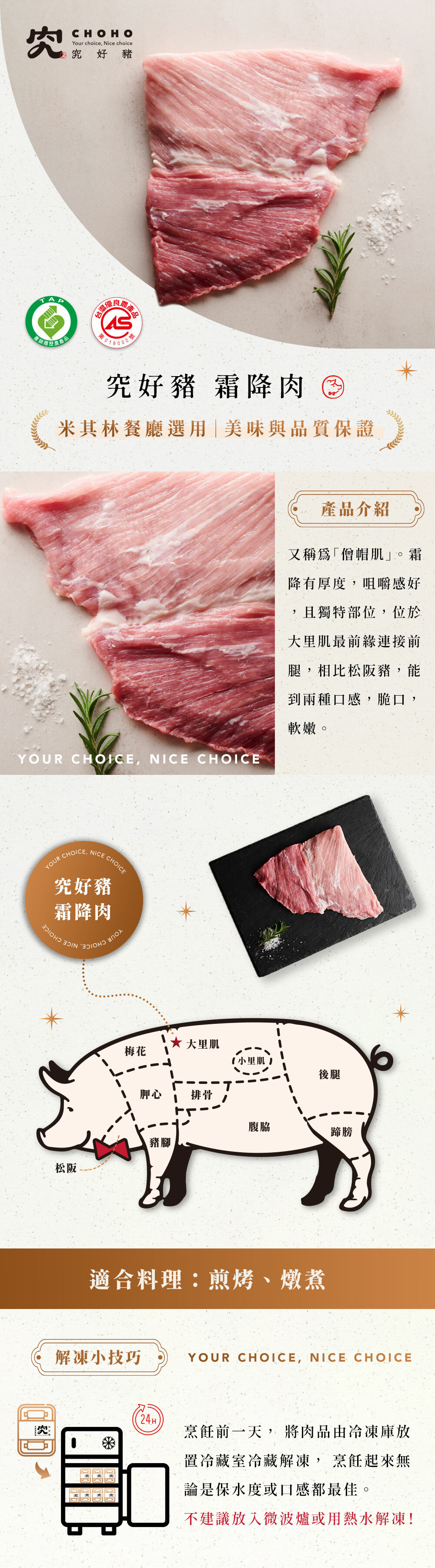 霜降有厚度,咀嚼感好,且獨特部位,位於大里肌最前緣連接前腿,相比松阪豬,能達到兩種口感,脆口,軟嫩。